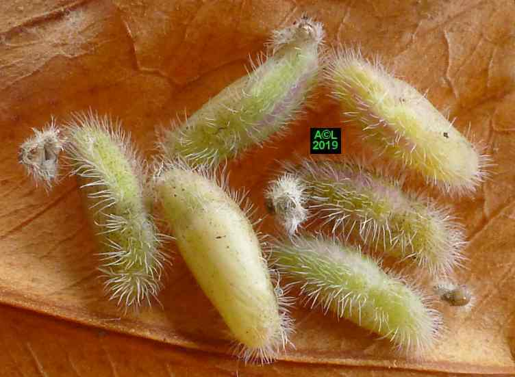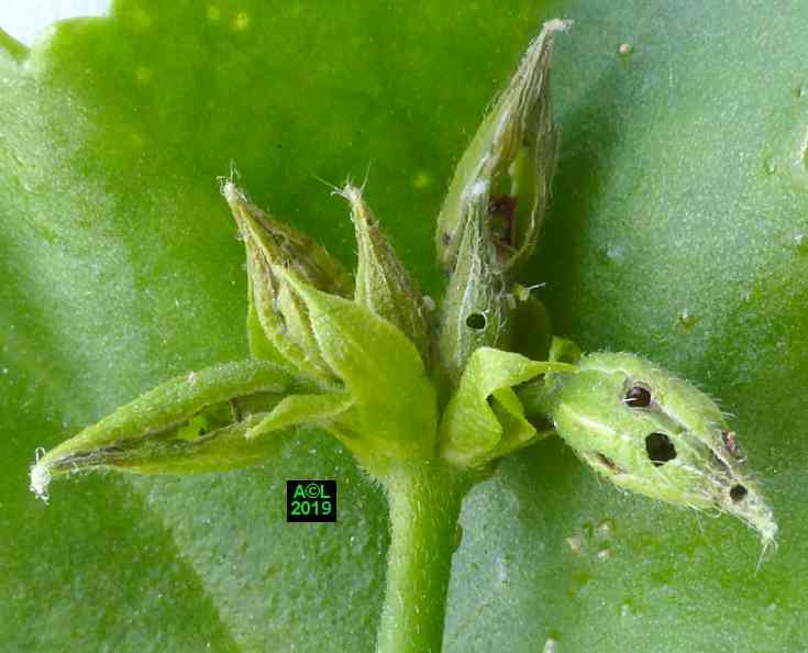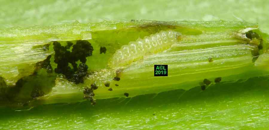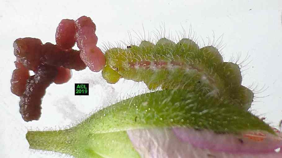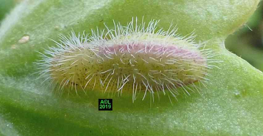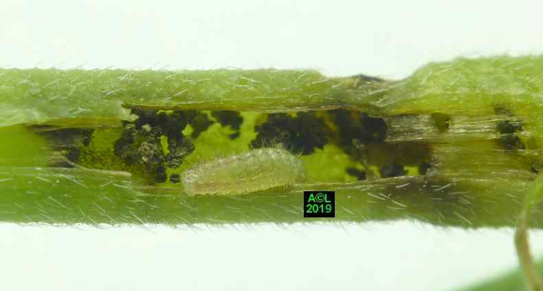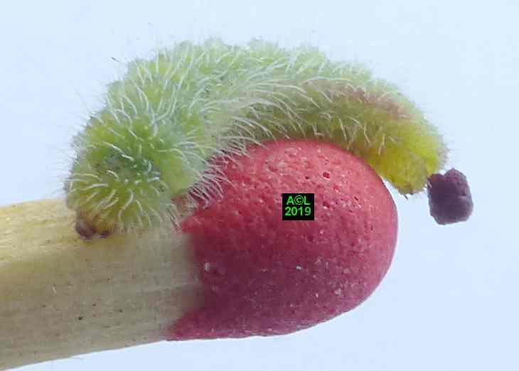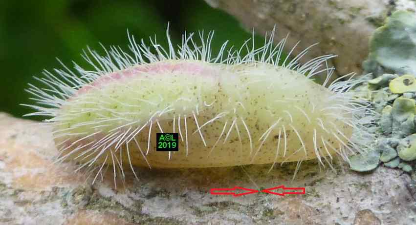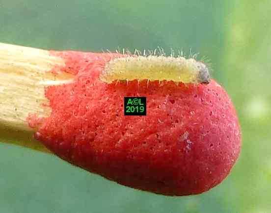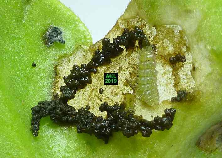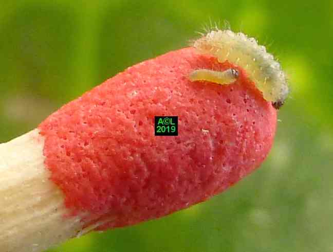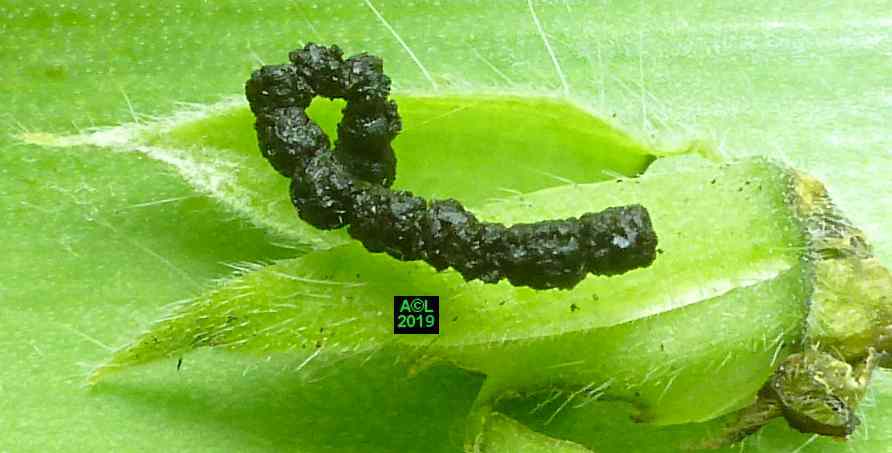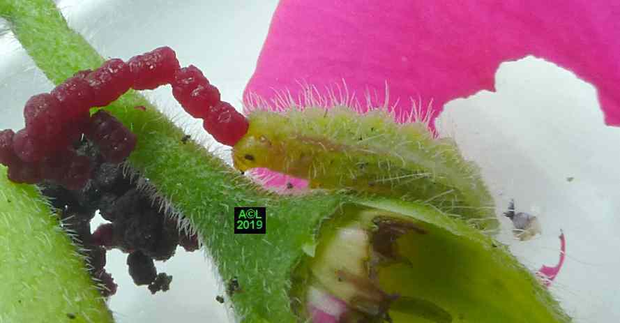 Les choses sont d'autant plus compliquées que cette chenille est petite, et que la tête, élément d'appréciation essentiel, est "escamotable" dans les replis du "cou", faculté dont la bestiole use et abuse. Pour couronner le tout, elle mue fréquemment au sein même des boutons floraux et des excréments qu'ils contiennent, d'où l'impossibilité de trouver et comparer les capsules céphaliques, véritable "preuve par 9" du niveau des stades larvaires. Vous l'aurez compris, les illustrations des 2e et 3e stades ne sont pas vraiment ... "garanties" !