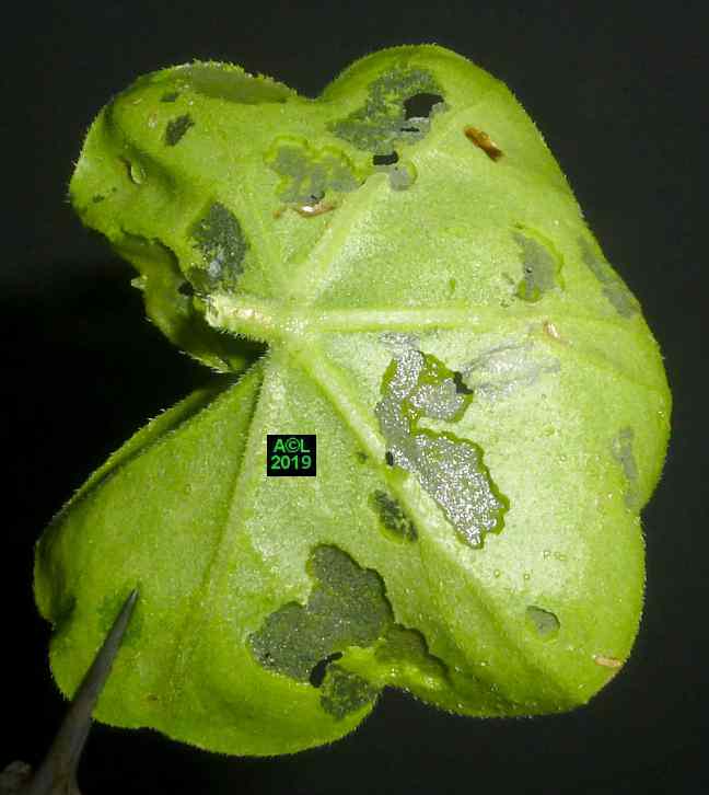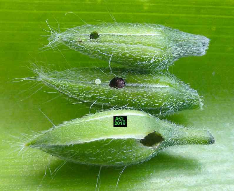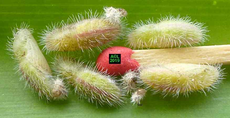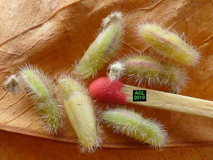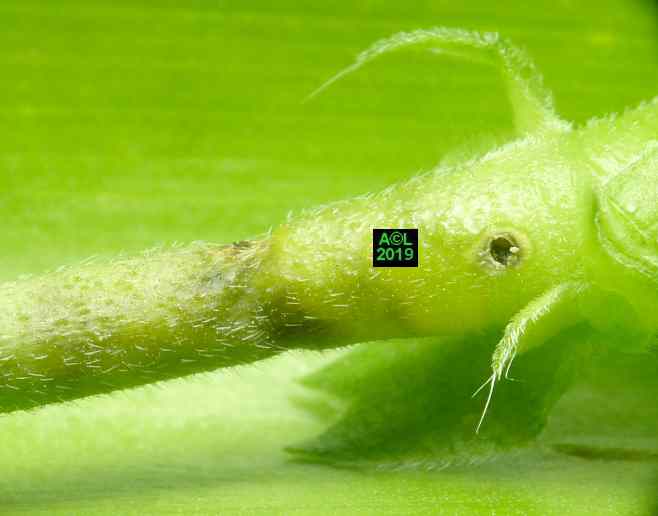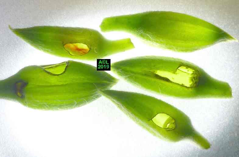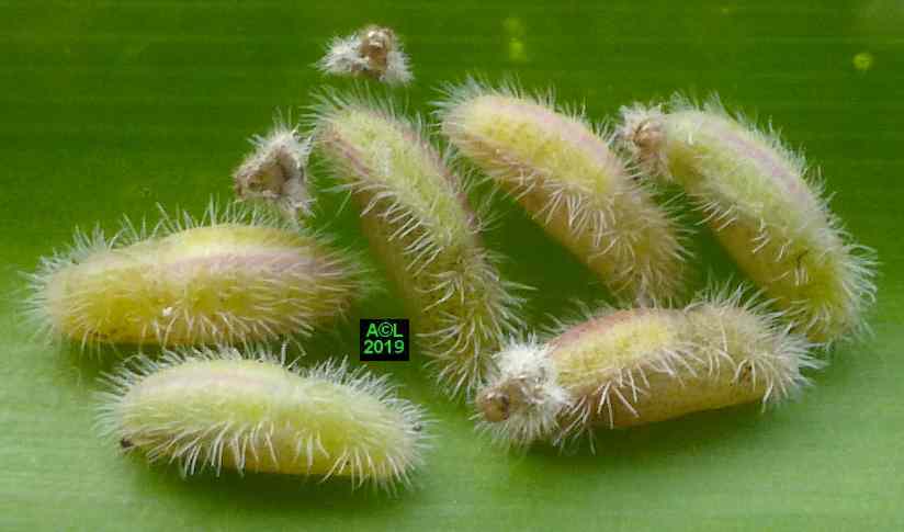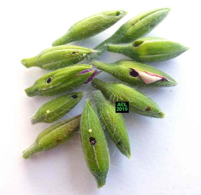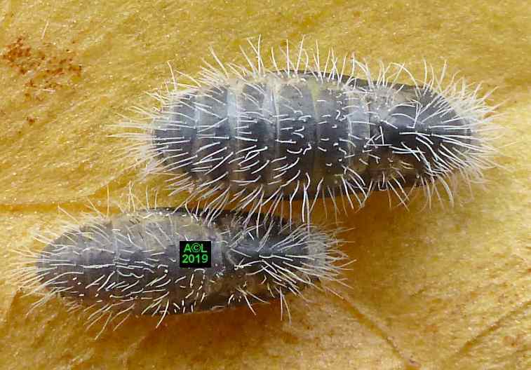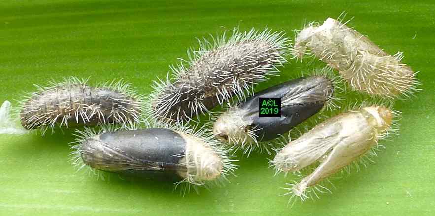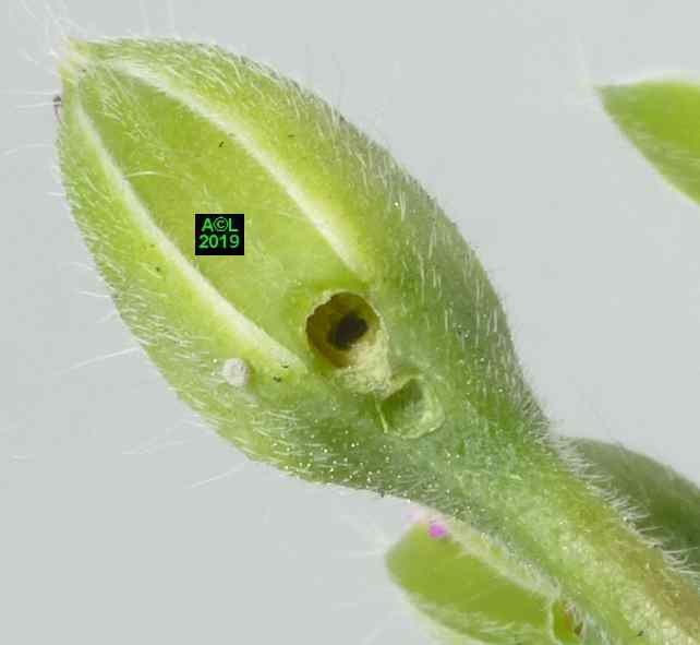 Les choses sont d'autant plus compliquées que cette chenille est petite, et que la tête, élément d'appréciation essentiel, est "escamotable" dans les replis du "cou", faculté dont la bestiole use et abuse. Pour couronner le tout, elle mue fréquemment au sein même des boutons floraux et des excréments qu'ils contiennent, d'où l'impossibilité de trouver et comparer les capsules céphaliques, véritable "preuve par 9" du niveau des stades larvaires. Vous l'aurez compris, les illustrations des 2e et 3e stades ne sont pas vraiment ... "garanties" !