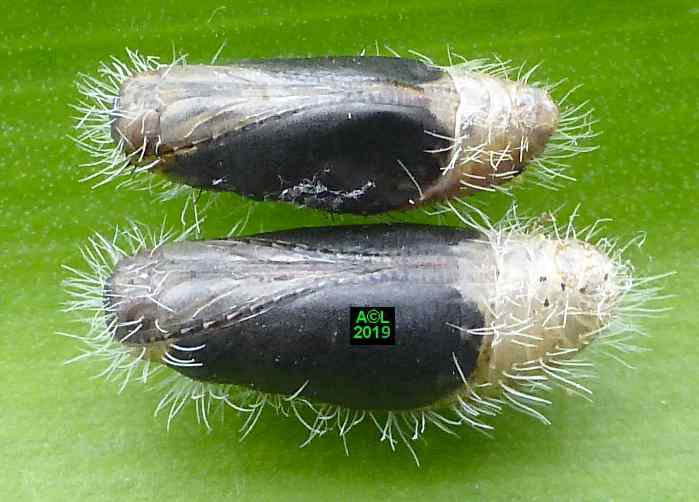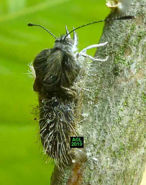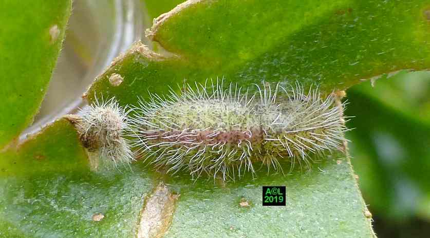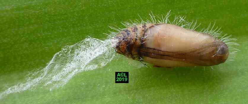 Arrivée au terme de sa croissance la chenille cesse bien sûr de s'alimenter et part en quête d'une zone à sa convenance pour se nymphoser, et donc se transformer en chrysalide, prélude au papillon qu'elle deviendra ... si tout se passe bien ! Il n'y a pas de gîte bien défini tout se passant généralement dans les jardinières, soit dans le feuillage proprement dit, soit sous les plantes nourricières, là où les débris végétaux ont tendance à s'accumuler. Les replis d'une feuille morte sont appréciés, tout comme la partie branchue jouxtant le substrat, mais les parois intérieures des jardinières conviennent pareillement. Le fait est difficile à vérifier, mais les chenilles les plus aventureuses peuvent très certainement chercher leur bonheur ( et le trouver ! ) au-delà desdites jardinières.
