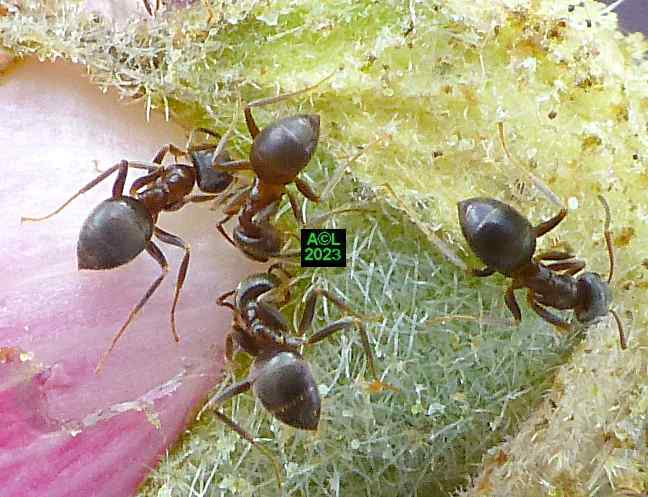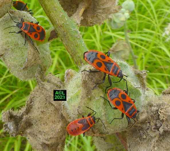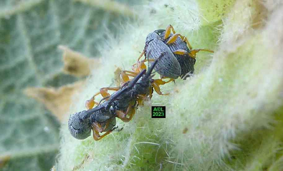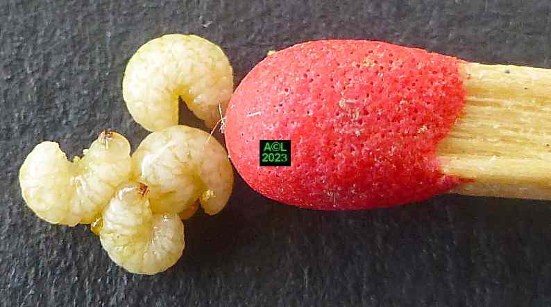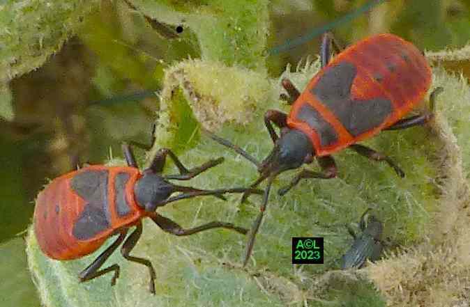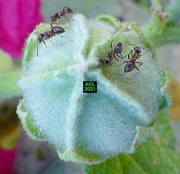 Quasi signature du site, la traditionnelle allumette (ci-dessous) illustre bien la petitesse millimétrique de notre Apion. Il s'ensuit évidemment une grande discrétion de la bestiole, d'autant que les "gendarmes" (Pyrrochoris apterus) sont aussi d'assidus "usagers" des trémières. En raison de leur nombre, de leur taille, et plus encore de leur très voyante parure rouge, ces punaises captent facilement le regard et l'attention, ce qui tend bien sûr à occulter la présence de nos minuscules apions. Les fourmis, elles aussi omniprésentes, font également diversion, et au final notre trio vit selon une sorte d'entente cordiale, si ce n'est en parfaite harmonie. A n'en pas douter cela tient à la luxuriance de la plante qui tel un "garde-manger" abondamment garni n'est pas de nature à favoriser la concurrence, ni l'agressivité pouvant en découler ... si tant est que ces contingences puissent exister !