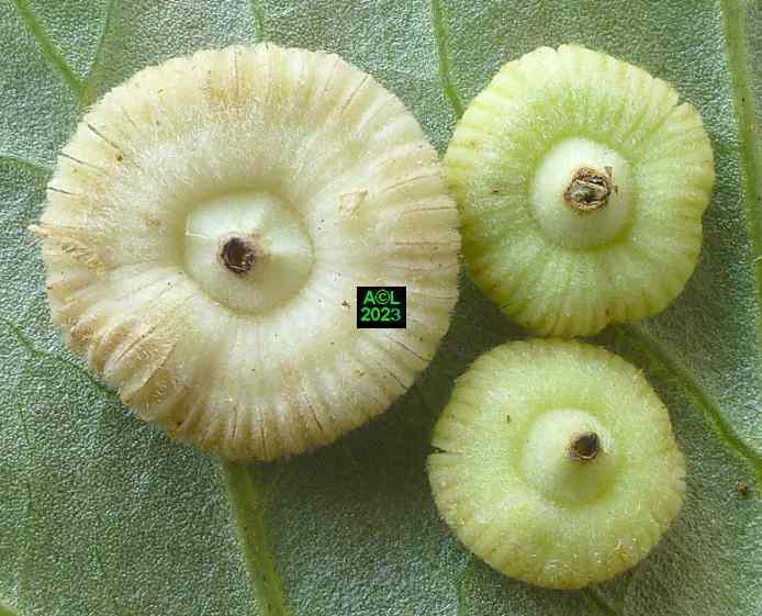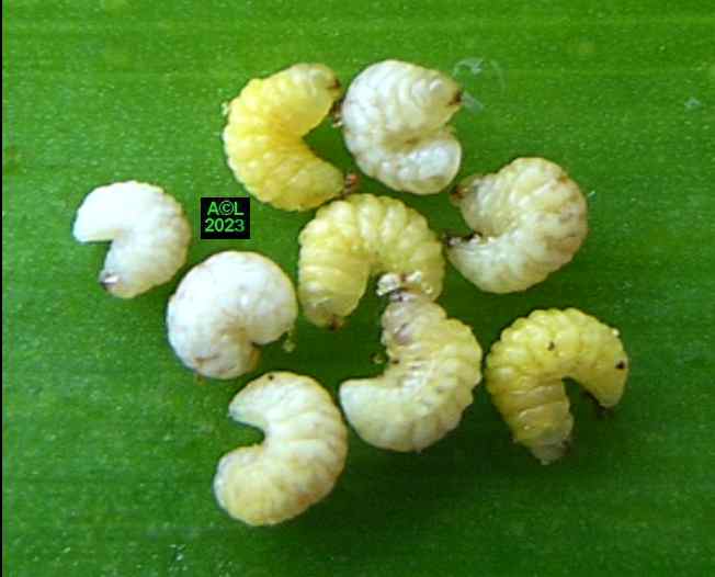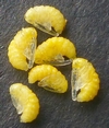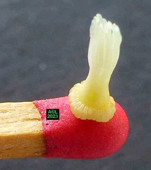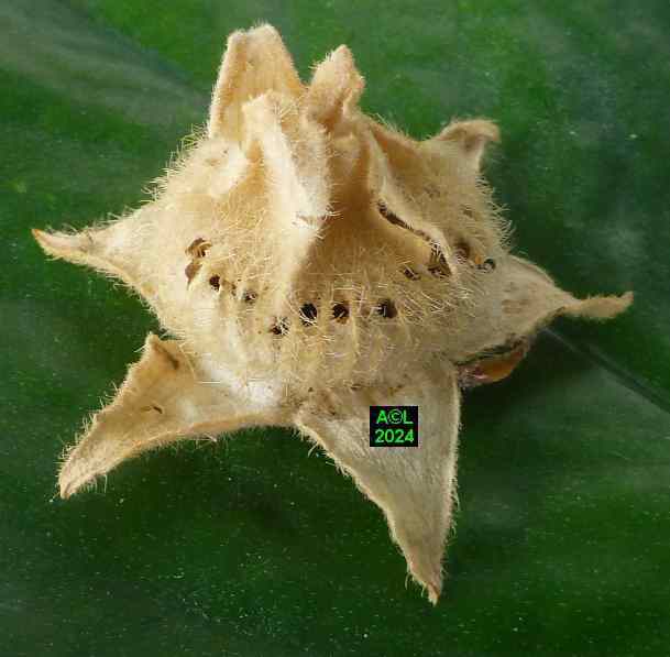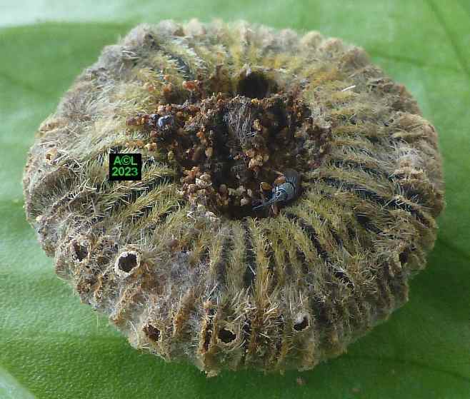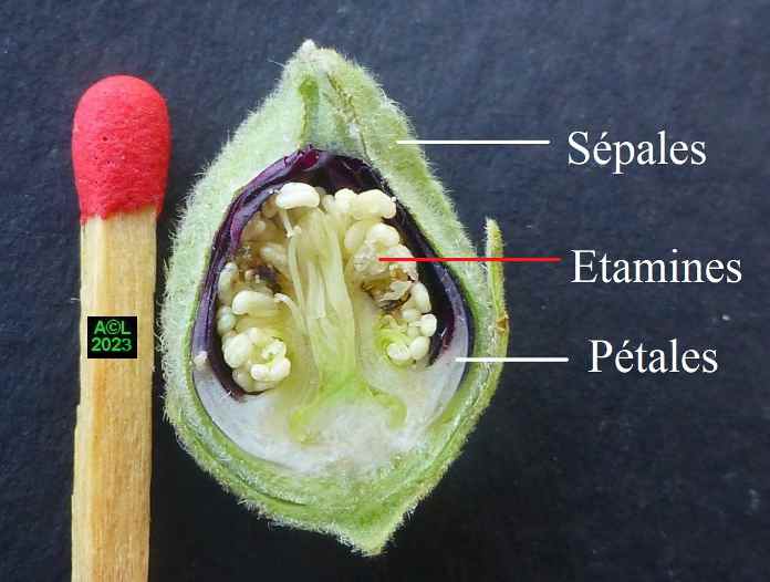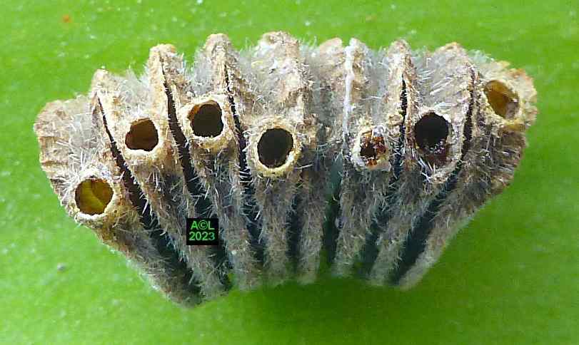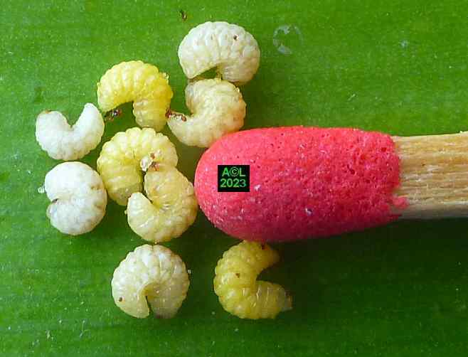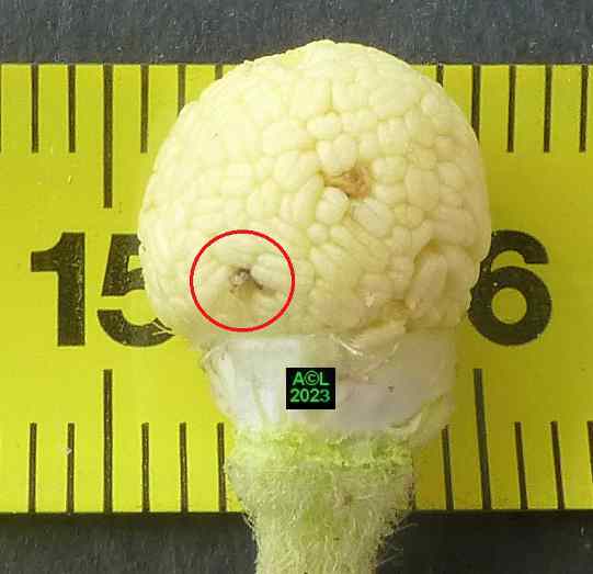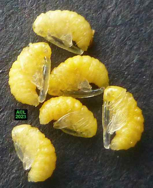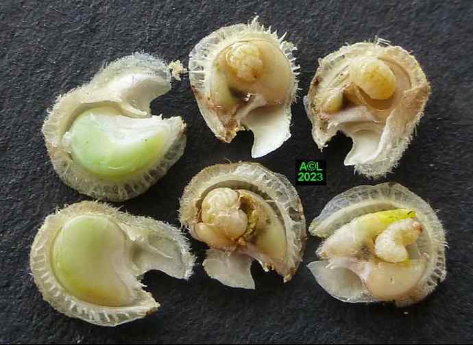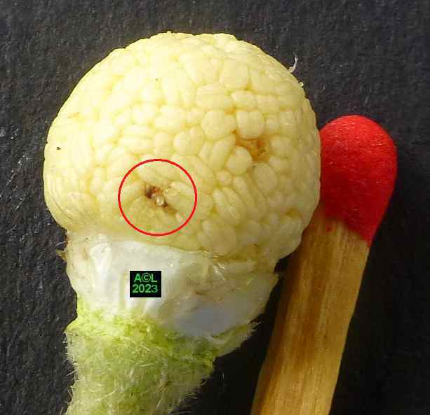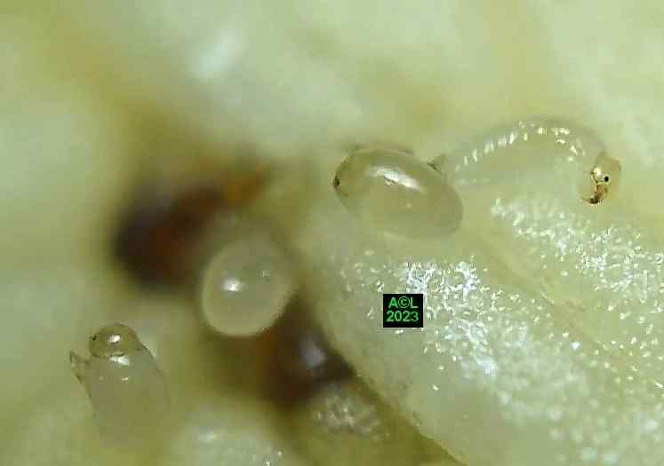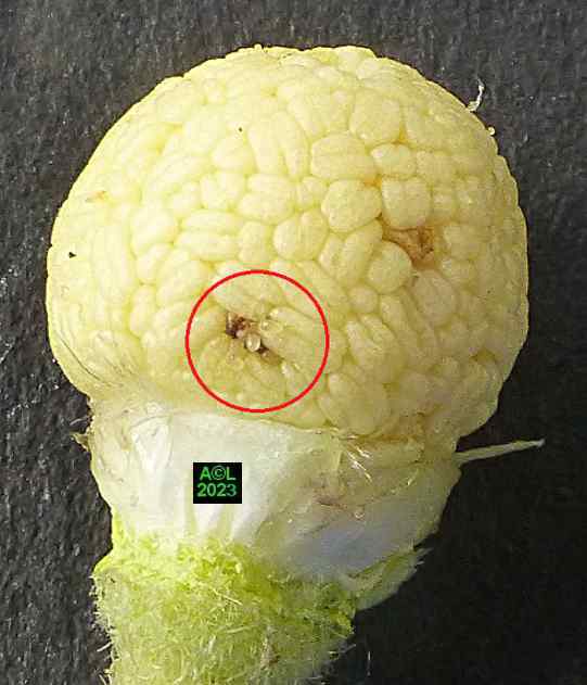 Les oeufs (toujours en petit nombre pour chacun des forages) sont déposés à la surface des étamines précitées lesquelles serviront de nourriture aux larvules qui migreront ultérieurement dans les graines une fois celles-ci formées. Les larves, chacune dans leur graine, pourront alors poursuivre leur développement et donner in fine une nouvelle génération de bestioles.