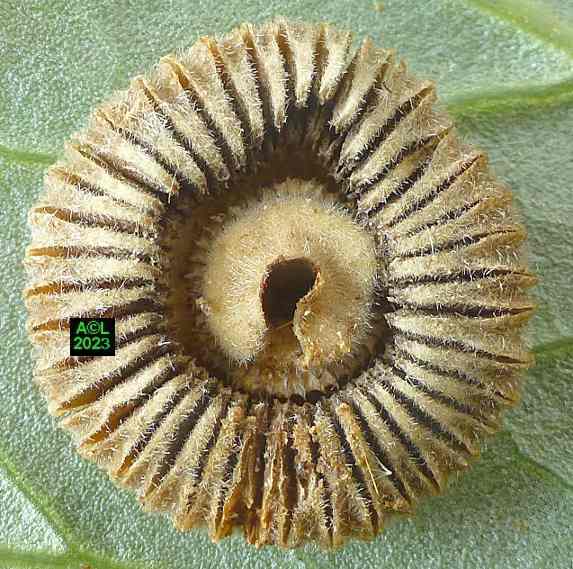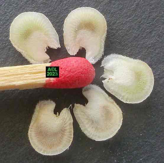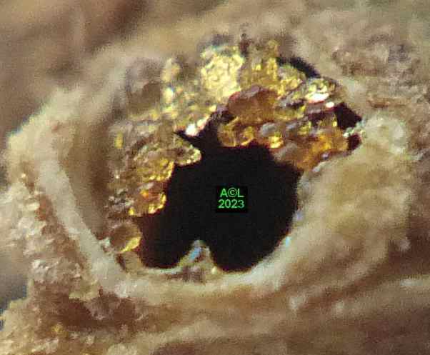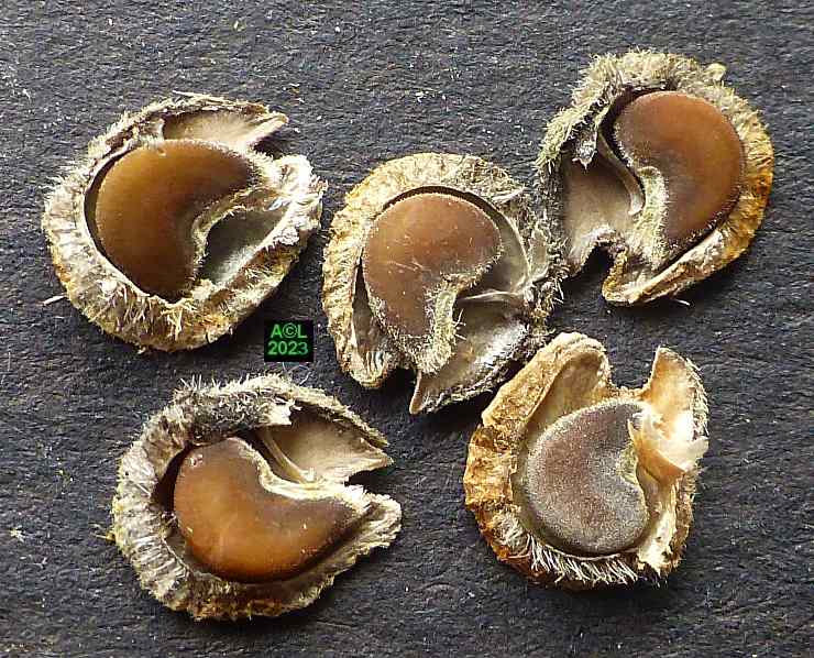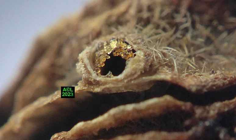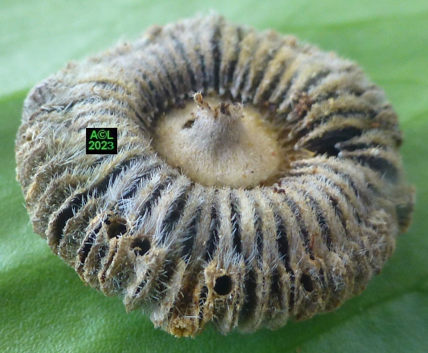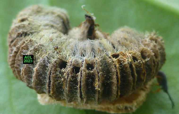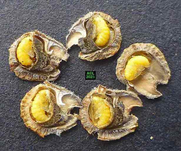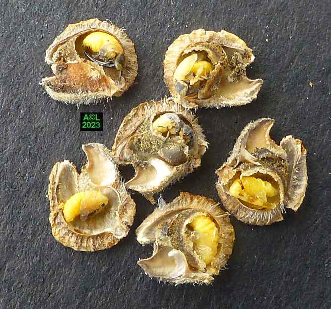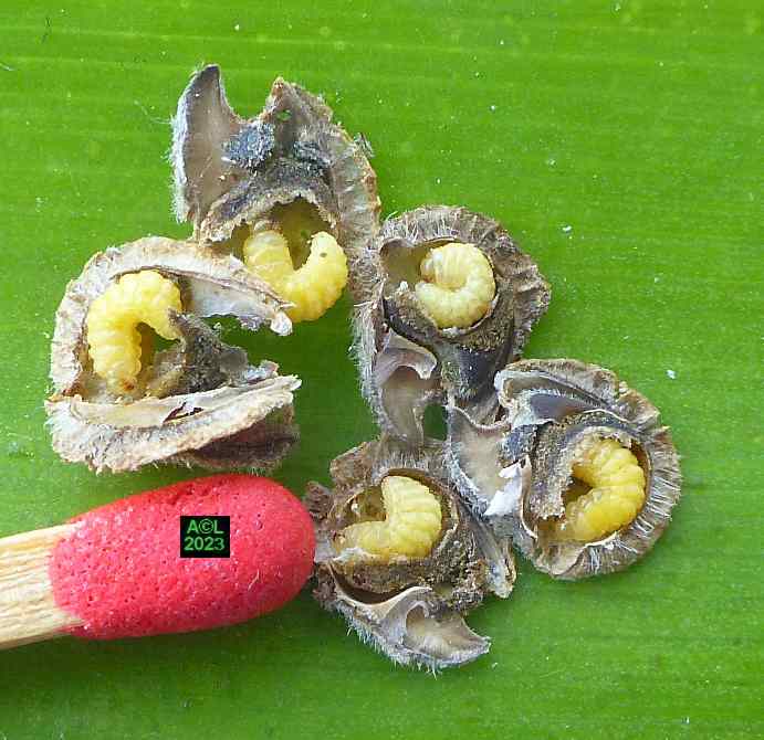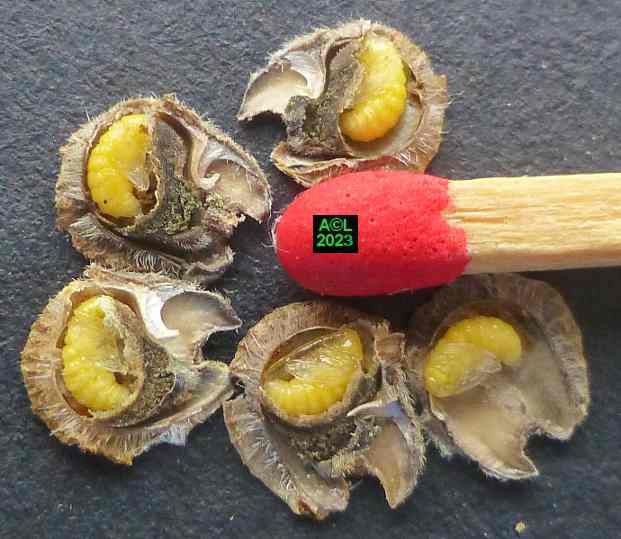La nature faisant toujours bien les choses (du moins le dit-on !) vous verrez que les larves préparent la sortie des insectes adultes en pratiquant une ouverture dans la très coriace enveloppe de la graine. En prélude à la nymphose cette ouverture sera obturée par un "bouchon" protecteur qui sera en temps voulu perforé, puis peu à peu grignoté pour permettre l'émergence du nouvel apion. Bizarrement l'émergence en question s'apparente souvent à une forme d'accouchement tant elle s'avère laborieuse. Reste à savoir si le trou pratiqué est toujours trop petit ... ou les bestioles toujours trop pressées de se dégourdir les pattes !