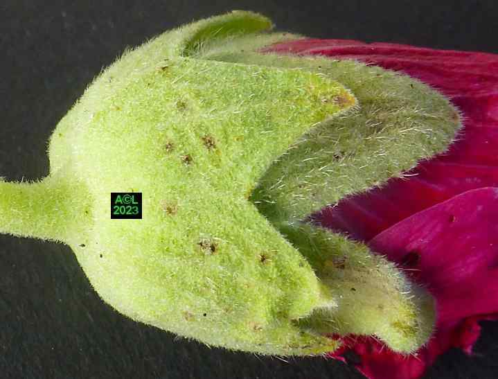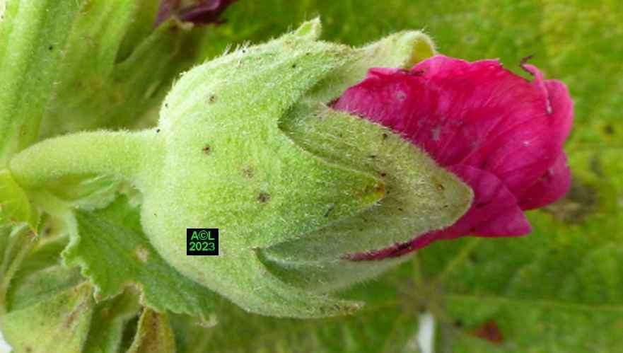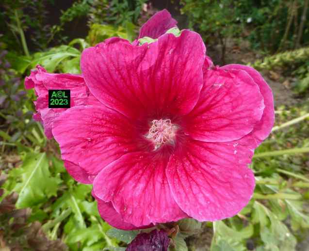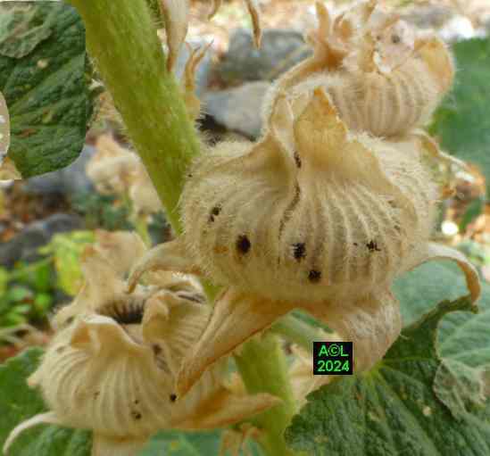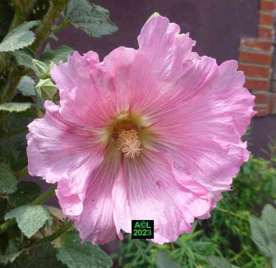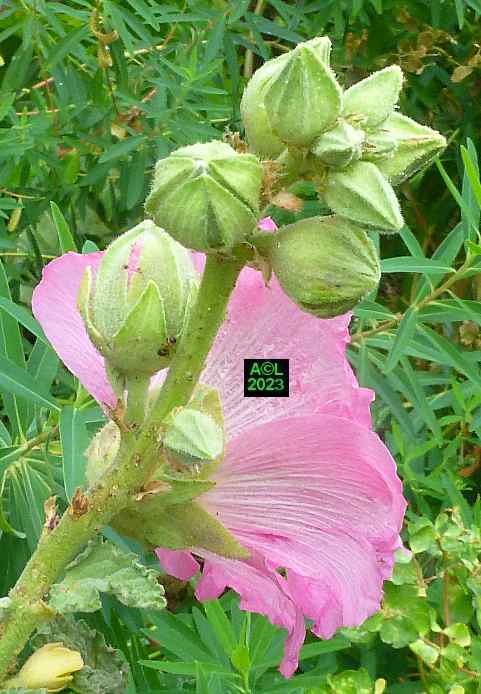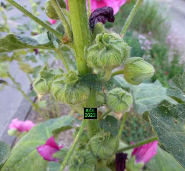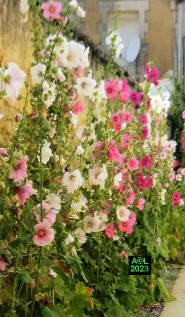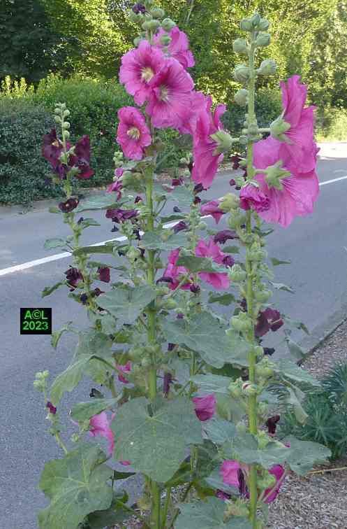 Nota: cette plante, au grand développement, porte des hampes florales atteignant couramment 1,5 m à 2 m, voire beaucoup plus. La floraison est abondante, les fleurs très grandes, et leur coloration très variée. La rose trémière a la particularité de pousser là où il lui plait, en ce sens qu'elle peut végéter en pleine terre (comme chez moi !), et se complaire dans la caillasse, voire dans une anfractuosité de dallage. C'est le cas par exemple des ruelles de certaines îles océaniques, comme Ré ou Oléron, où elles prospèrent (et c'est peu dire !) quasiment dans le bitume le long des murs et façades des maisons.