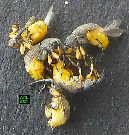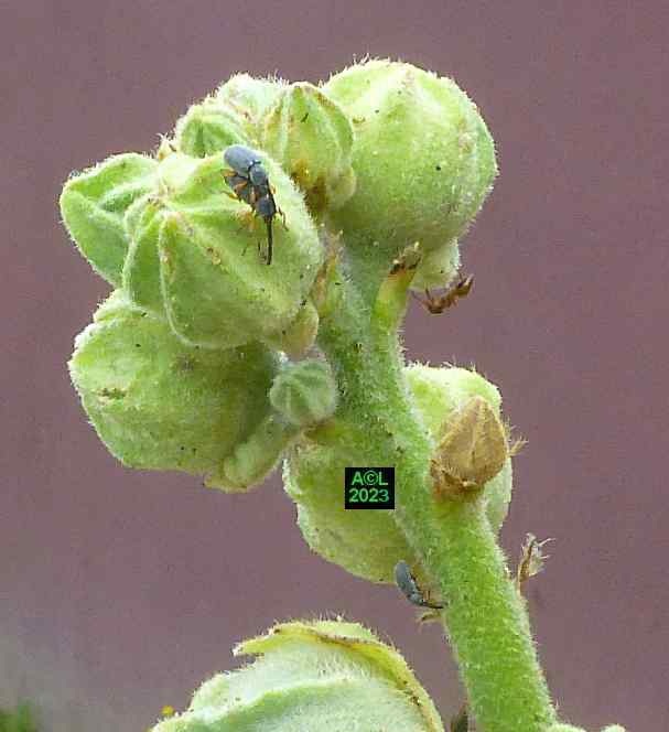 En dépit de l'échelonnement des pontes, et donc de celui des développements larvaires et des émergences, il n'y a qu'une génération annuelle à telle enseigne qu'en milieu pourtant confiné les plus alléchants boutons floraux proposés n'ont pas attiré le moindre individu parmi les nombreux émergeants, et ce quel que soit le sexe. Par-delà l'absence évidente de besoins alimentaires la seule préoccupation de cette nouvelle génération était manifestement de me fausser compagnie afin que chacun puisse trouver un gîte d'hivernage à sa convenance. Bien qu'elles soient vivaces, et puissent donc fleurir tous les ans, je rappelle que les roses trémières sont souvent cultivées en bisannuelles ... au grand dam des apions ! En pareil cas la floraison intervient en effet la seconde année, la première étant consacrée à la seule croissance de la plante.