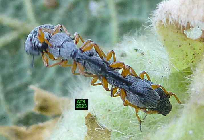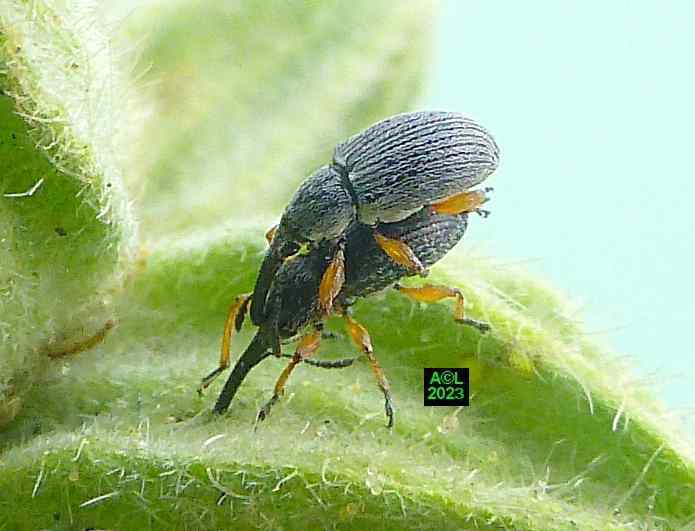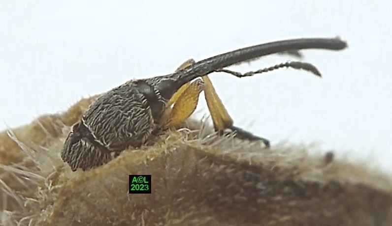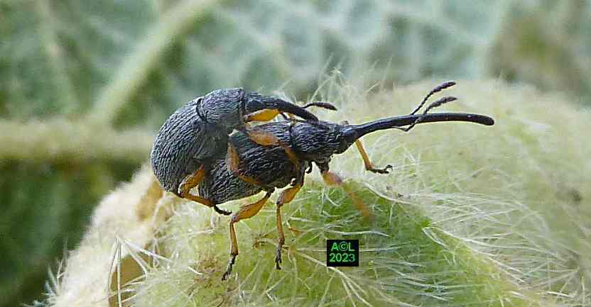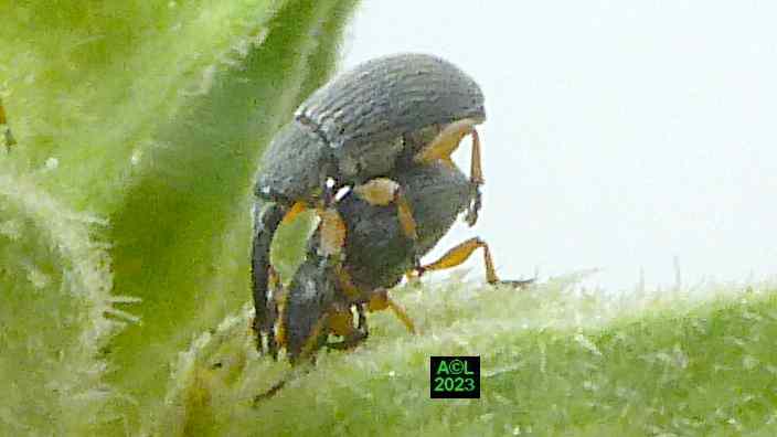 L'apion longirostre, ci-dessous représenté, est un petit Coléoptère faisant partie des très nombreux "charançons" (près de 1500 espèces en France). Numériquement parlant la palme revient aux très atypiques coléoptères que sont les Staphylins, avec 2500 espèces sur notre sol. Toujours pour info, et toujours "chez nous", on dénombre 10862 espèces de coléoptères (source Taxref 2022). Comme tous les "charançons", cet apion porte un "rostre", d'ailleurs fort long, d'où la dénomination latine de Rhopalapion longirostre. Comme vous le verrez cette longueur a sa raison d'être, au demeurant primordiale puisqu'elle conditionne la pérennité de l'espèce.