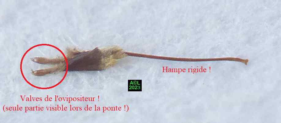 Au terme de son creusement, et du pertuis ainsi réalisé, la femelle retire son rostre et se retourne illico pour y introduire son ovipositeur, autrement dit son organe de ponte. Ce dernier, très particulier, est à l'image de la démesure du rostre, puisqu' il doit atteindre le fin fond du forage. Hormis son extrémité, seule partie momentanément visible lors de la ponte, l'ovipositeur est en effet doté d'une partie pouvant se qualifier de télescopique, prolongée par une hampe rigide atteignant la quasi longueur de l'abdomen, comme chez les balanins (nota ci-dessous)