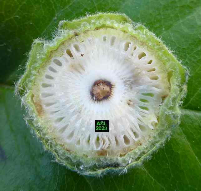 Une fois l'emplacement à sa convenance déterminé, la pondeuse y enfonce profondément son rostre, en procédant petit à petit par grignotage. Il lui faut en effet atteindre la surface du noyau central constitué par le très dense compactage des étamines en devenir. Au préalable la bestiole devra perforer la très épaisse et charnue double enveloppe protectrice des sépales (formant le calice de la fleur), ainsi que l'ébauche des futurs pétales.