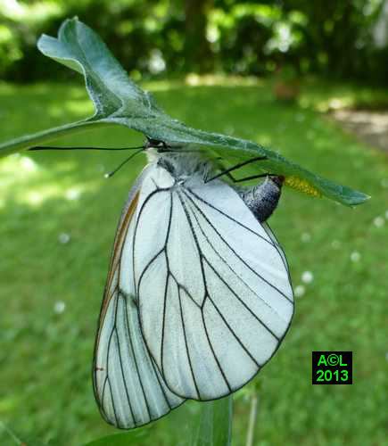 Tout de blanc vêtu, et délicatement nervuré de noir, tel se présente Aporia crataegi, plus communément appelé le "Gazé", ou encore la "Piéride de l'aubépine". Au passage vous noterez que son nom scientifique fait à la fois référence à sa plante nourricière de prédilection, et à la réduction du nombre des écailles, nettement observable chez les femelles.