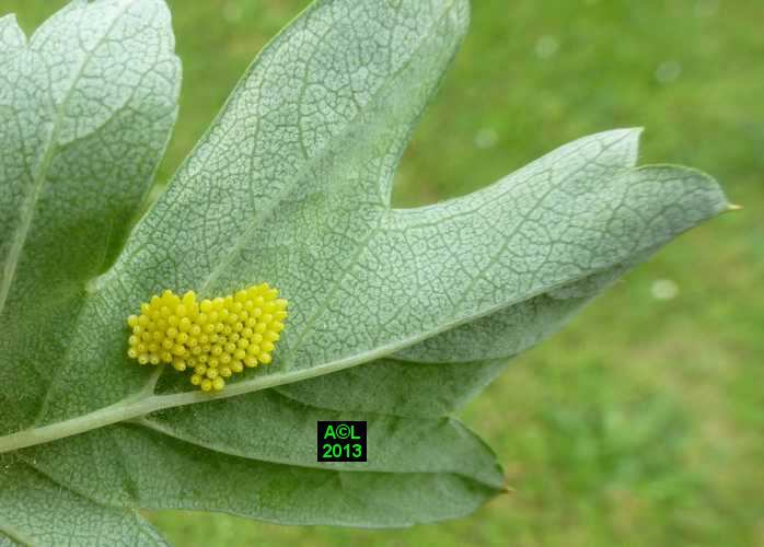 .J'étais bien sûr ravi, mais loin d'imaginer la suite, car entre le 12 et le 27 juin (2013 ! ) la femelle m'a gratifié de 15 pontes pour un total de 1278 oeufs ! Si on me l'avait dit, je ne l'aurais pas cru tant ce chiffre est exceptionnel, car chez les papillons dits "de jour" la norme est de l'ordre de 200 à 300 oeufs. Certes cette femelle était on ne peut plus "bichonnée", et la réduction de son espace vital limitant ses besoins énergétiques, on peut supposer que le surplus a profité à la ponte. C'est là une simple hypothèse car il faut également tenir compte de l'hivernage des très jeunes chenilles, d'où un facteur de risque important ... et la nécessité de compenser la "casse" !