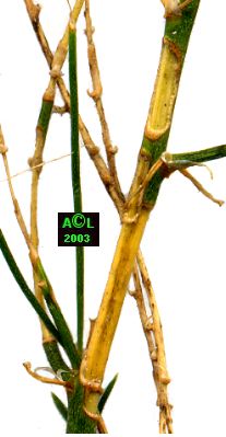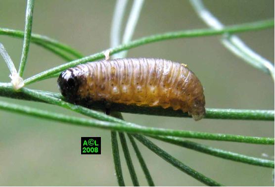 Bien entendu les parasites ne sont jamais bien loin, et ils régulent (au moins en partie !) la "démographie" de notre Criocère. Présentement il s'agit d'un Diptère, autrement dit d'une mouche (au sens large du terme). L'asticot (dénomination des larves de Diptères !) se développe au sein même de l'hôte, et le moment venu il le quitte pour se transformer en pupe (équivalent de la chrysalide du papillon !) puis en insecte dit "parfait". Dans l'exemple ci-dessous la pupe (vide !) est restée enchâssée dans ce qui reste du corps de la larve de Criocère .... à savoir l'enveloppe !