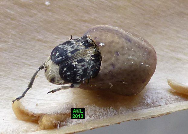 A en croire la littérature spécialisée, la Bruche du pois ( Bruchus pisarum ! ) est strictement monophage, et ne se développe que sur le pois (Pisum sativum). Dans la mesure où la bestiole ci-dessous fait plus que lui ressembler, doit-on considérer que cette bruche s'est adaptée à d'autres pois, fussent-ils de senteur, ou qu'il s'agit en fait d'une espèce voisine, voire jumelle, cas de figure loin d'être exceptionnel au pays des bestioles !