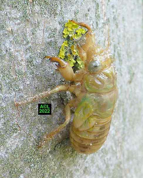 L'ouverture ainsi générée va permettre l'émergence progressive de l'insecte adulte. Allant de paire la coloration définitive et le durcissement des téguments feront suite, le processus demandant plusieurs heures. A terme la bestiole s'en ira vivre sa vie ( telle que prévue par Dame Nature ! ) et entre autres "chanter" (cigale oblige ! ) si c'est un mâle !