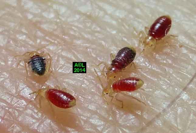 Comme toujours chez les insectes la durée du développement est essentiellement fonction de la température et de la nourriture, mais en trouvant gîte et couvert là où nous habitons le cycle des bestioles s'en trouve plus ou moins optimisé et régulé aux alentours d' 1 mois et demi à 2 mois "d'oeuf à oeuf". Contrairement aux insectes soumis à des métamorphoses dites complètes (chenille /chrysalide/ papillon par exemple) l'évolution des Cimex se fait au cours de 5 stades larvaires, quasi copies de l'adulte ... taille en moins ! La croissance des larves est bien sûr tributaire de la prise de nourriture, chaque passage au stade supérieur nécessitant au moins un repas sanguin ... et le temps de le digérer !
