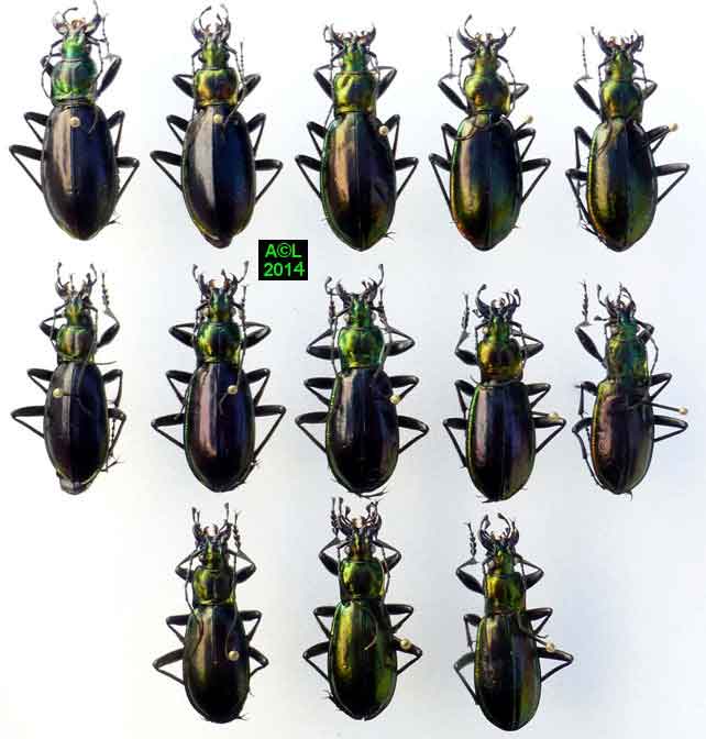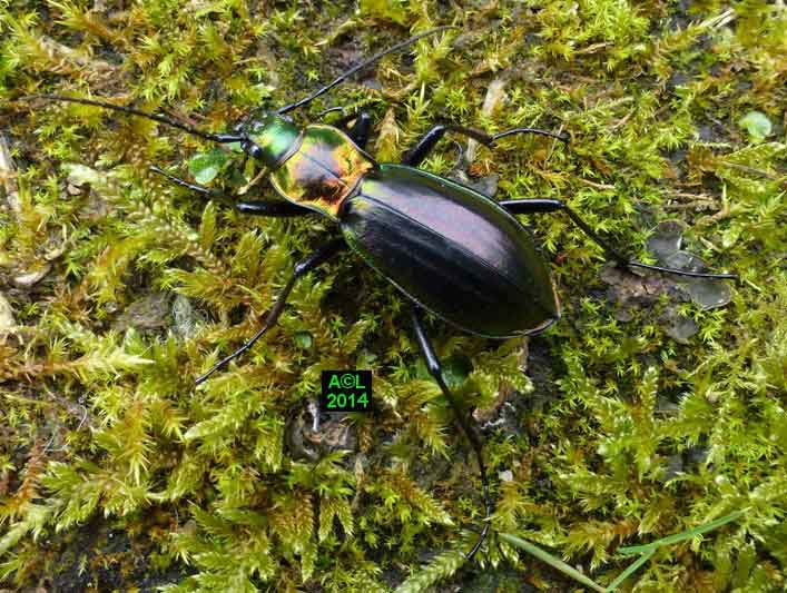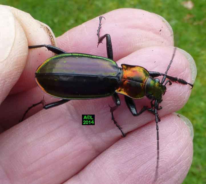 Dans une vieille canette de bière trouvée sur place, et recyclée illico en piège à carabes, il y avait un mâle plutôt petit, limite "racho", avec des élytres en grande partie noirâtres. La bestiole était manifestement peu ordinaire, mais aussi passablement "usée" par les aléas du métier de carabus, ce qui pouvait accréditer la thèse d'un mélanisme "mécanique" dit d'érosion, et donc sans intérêt, puisque résultant d'une simple abrasion des téguments ( sur les caillasses par exemple).