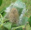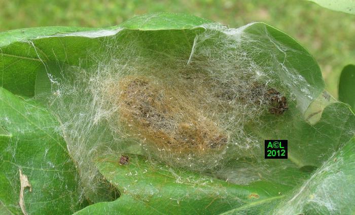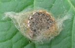 Sitôt émergées des entrailles de la chenille, les larvules parasites vont alors opter pour la formule ... "lotissement" ou "HLM" ! Suivant les espèces d'Apanteles, les cocons sont en effet tissés individuellement ( tout en restant "groupir" ! ) ou au contraire rassemblés au sein d'un cocon collectif. Par son aspect et sa texture ce dernier genre de cocon ressemble à s'y méprendre à une ponte d'araignée, et c'est encore plus vrai quand la dépouille de la chenille se désolidarise et tombe à terre, cas de figure le plus habituel.