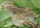 Cela précisé, imaginez un tout jeune nid estival de "cul-brun", tissé à l'extrémité d'une branche basse de l'un de mes chênes, et une mouche tachinaire venant y parasiter les minuscules chenilles. L'occasion était trop belle ( et même exceptionnelle ! ), pour ne point la saisir, mais pour 3 minutes de vidéo il m'a fallu 3 jours de guet ... et des ruses de sioux ! Tenu d'une main l'APN prenait en effet appui sur un fer à béton planté dans le sol, l'autre main servant à courber ledit fer afin de suivre au plus près (quelques cm) les évolutions de la tachinaire en veillant bien sûr à ne point l'effaroucher ! Autant dire que la corbeille de l'ordi n'a pas chômé.