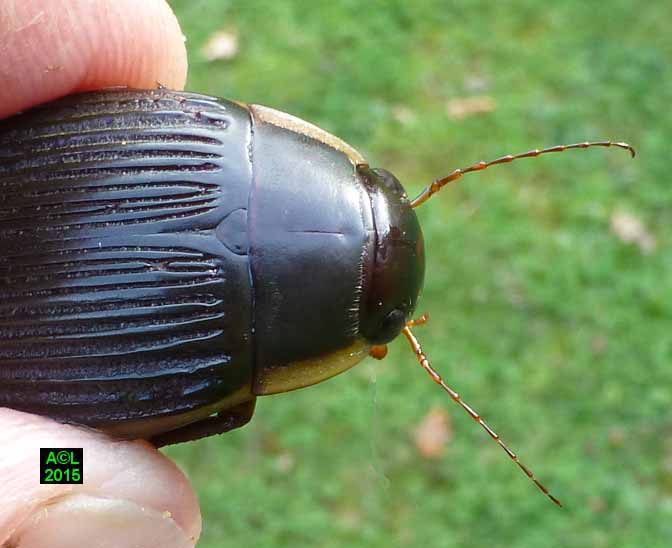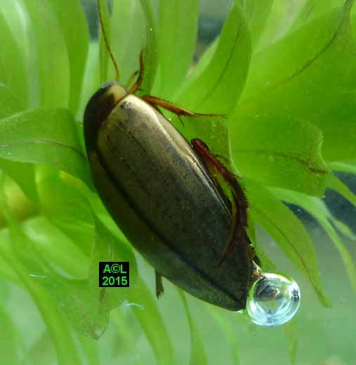 L'accouplement est automnal et les femelles fécondées de Dytiscus marginalis (et autres espèces ! ) sont reconnaissables à une sorte d'enduit blanc "collé" à la partie ventrale de l'extrémité abdominale. Cette sécrétion est parfois comparée au très curieux "sphragis" des femelles fécondées des papillons "apollo". Dans les 2 cas il s'agit en effet d'une sorte de "ceinture de chasteté" secrétée par le mâle lors de l'accouplement, et de ce fait ce sont les autres mâles ... qui "se mettent la ceinture" ! Contrairement au papillon précité, où la femelle est à usage unique ( si je puis dire ! ), rien n'empêche les femelles de dytiques de s'accoupler à plusieurs reprises une fois l'enduit tombé ... et donc l'interdiction levée !.