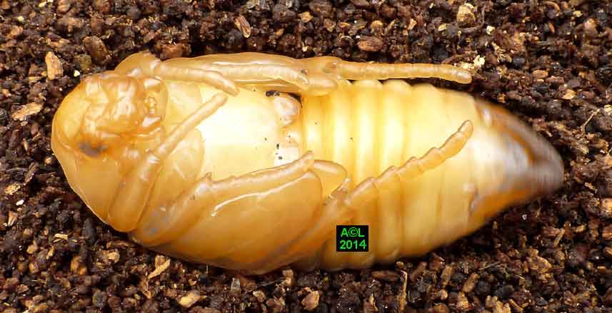 Contrairement à certaines cétoines, telle la "dorée" (Cetonia aurata, voir site), qui passent l'hiver au sein de "coques" parfaitement individualisées et solidement constituées, les logettes du Gnorimus sont moins durablement élaborées car il n'y a pas d'hivernage, d'où une phase nymphale considérablement réduite. Elles sont en outre susceptibles de varier d'aspect et de consistance, en intégrant par exemple un fort pourcentage de particules boiseuses là le volume de terreau disponible est réduit, ou au contraire en privilégiant le terreau là où il abonde.
