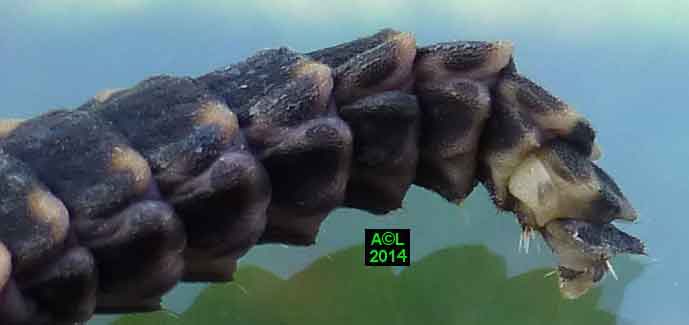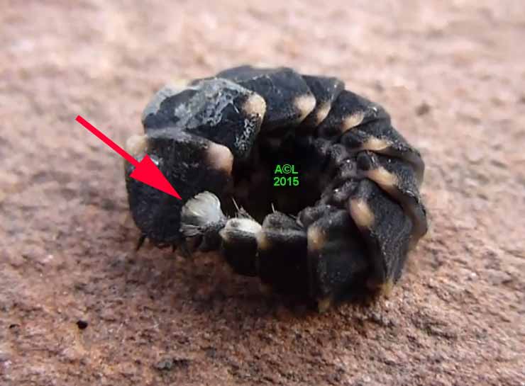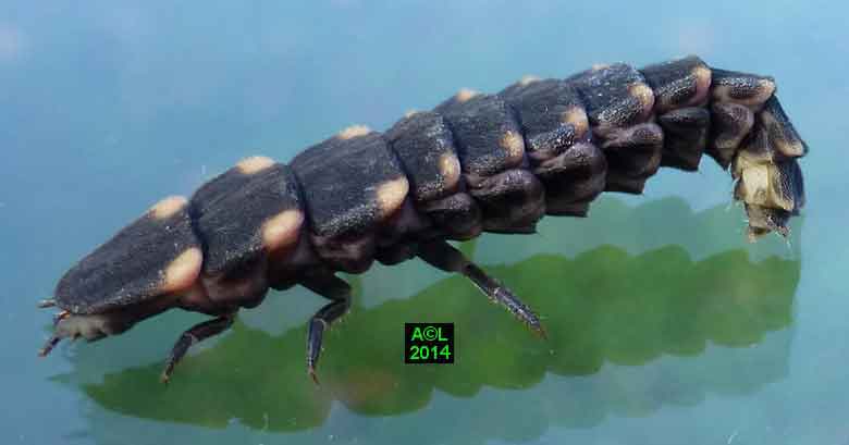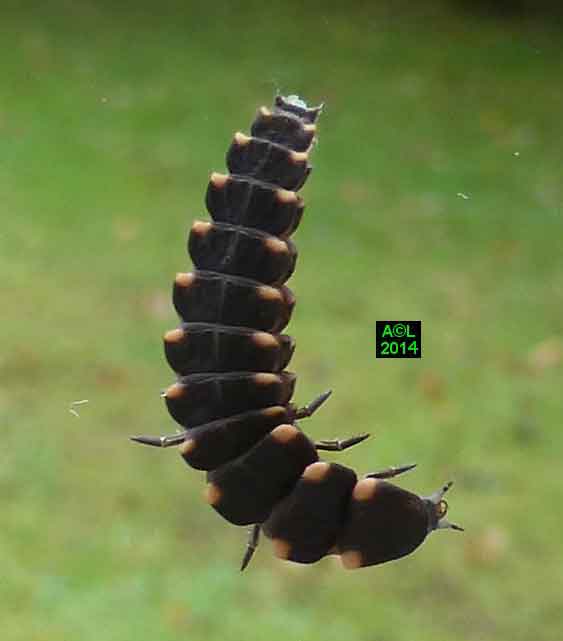 La larve du lampyre dispose de 6 pattes parfaitement fonctionnelles, mais elles sont dépourvues d'ongles griffus, apanage de l'adulte, et se terminent donc par une simple pointe chitinisée, à l'évidence moins performante. Afin de parfaire le maintien et la propulsion, Dame Nature a prévu un "pygopode", sorte de "béquille" fonctionnant à la manière d'une 7e patte (à voir en vidéo ! ). Concrètement l'extrémité abdominale se replie, et fournit ainsi un appui supplémentaire (synchro avec les pattes), permettant de s'arque bouter, et au besoin de pousser pour faciliter la progression, ou encore "crapahuter", par exemple en terrain pentu ou accidenté.