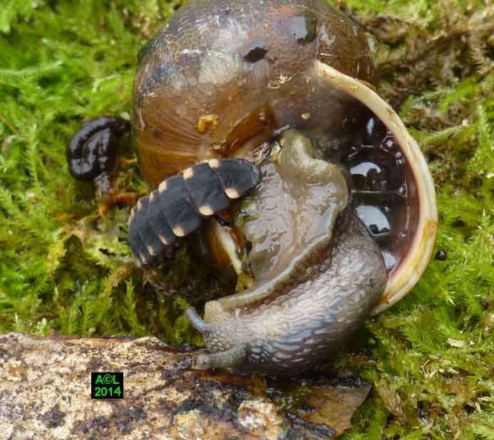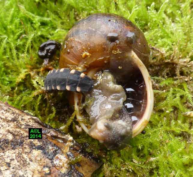 Grand consommateur d'escargots, mais aussi de visqueuses limaces (en net 2e choix me semble-t-il !), le Lampyre marque là encore sa différence en usant d'une technique pour le moins originale, et quasi chirurgicale. Il anesthésie en effet ses proies avant de les consommer, et il s'agit bien d'une anesthésie car les escargots en question sont susceptibles de "récupérer". Bien entendu il ne faut pas laisser le Lampyre passer à table, car c'est un adepte de la digestion extra orale, et à ce titre il liquéfie littéralement les tissus de sa victime avant de les absorber. Cette précision apportée, l'anesthésie en question est si efficace, et si subtilement instillée, que les quelques morsures infligées à cet effet paraissent d'aimables bécots, et ne provoquent aucune réaction de défense de la part de la victime ( rétraction dans la coquille, ou émission de mucus par exemple). Ces dernières demeurent toutefois possibles avec des proies de grande taille, mais il en faut plus pour éviter ... le "passage à la casserole" !