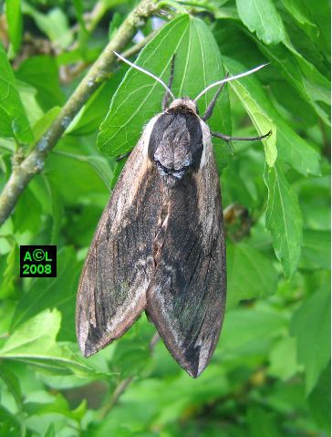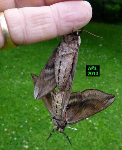 Comme chez la plupart des Sphinx, le dimorphisme sexuel est plus que discret, voire nul pour le profane. Les femelles sont en principe plus grandes, et l'abdomen logiquement plus volumineux, mais ce n'est pas toujours évident quand la ponte est bien avancée. Par opposition l'abdomen des mâles est plus pointu et il se termine par 2 valves génitales accolées qu'avec un peu de chance vous verrez s'ouvrir ... et se refermer !