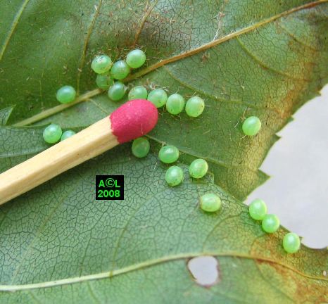 La ponte commence la nuit suivant l'accouplement, et elle peut se prolonger plusieurs jours , voire plusieurs semaines, y compris en élevage si la prise de nourriture est régulière et suffisante. Les oeufs sont joliment verts, relativement gros, et ils sont le plus souvent pondus au revers des feuilles nourricières, tantôt isolément, tantôt par lots comme ci-dessous. Présentement j'ai obtenu une cinquantaine d'oeufs, mais il s'agissait d'une femelle sauvage, et à coup sûr d'un reliquat de ponte. Ultérieurement une femelle captive a été nettement plus prodigue puisqu'elle m'a gratifié de ...avant de recouvrer sa liberté.