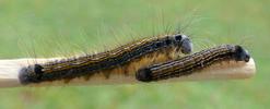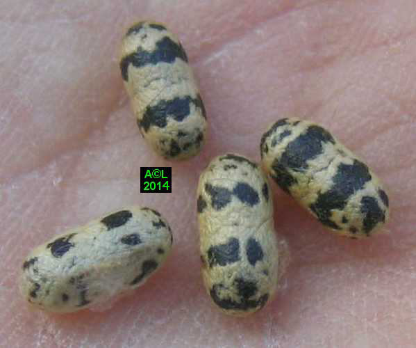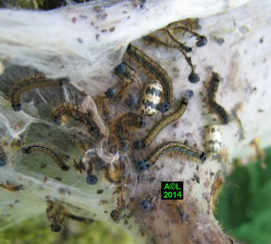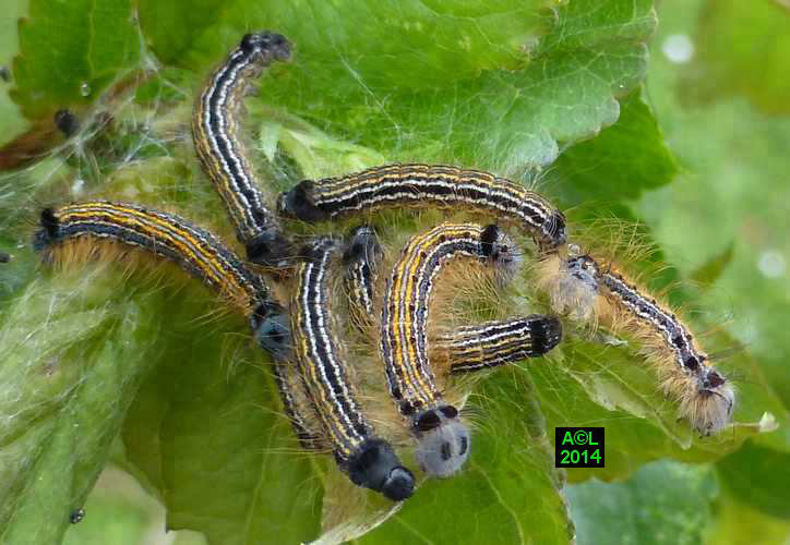 (*) J'avoue tout ignorer de cette excrétion (origine, composition, raison d'être), sauf à supposer qu'il pourrait s'agir d'urates, autrement dit de déchets organiques rejetés lors du tissage. Le même "phénomène", en nettement plus abondant, s'observe chez la "Feuille morte du chêne" (Gastropacha quercifolia) cf. site. Si un lecteur peut éclairer ma lanterne, je suis bien sûr preneur des 2 mains !