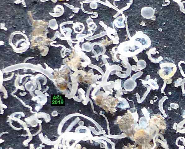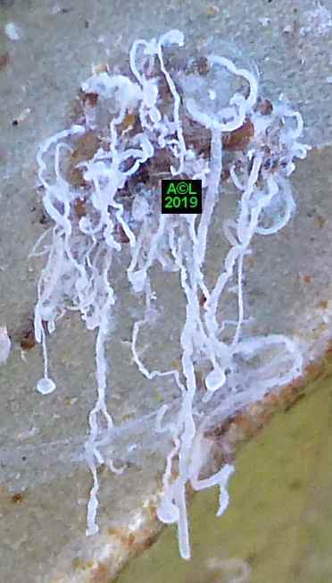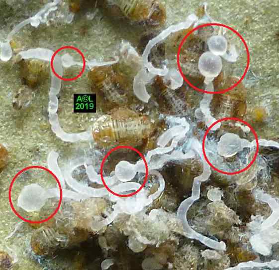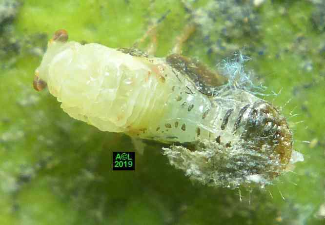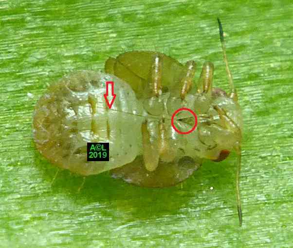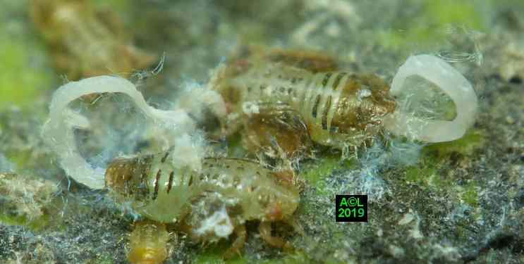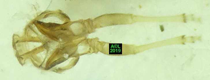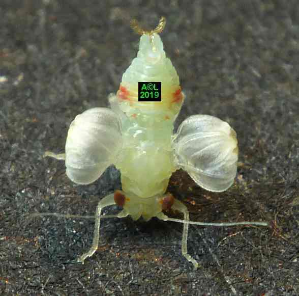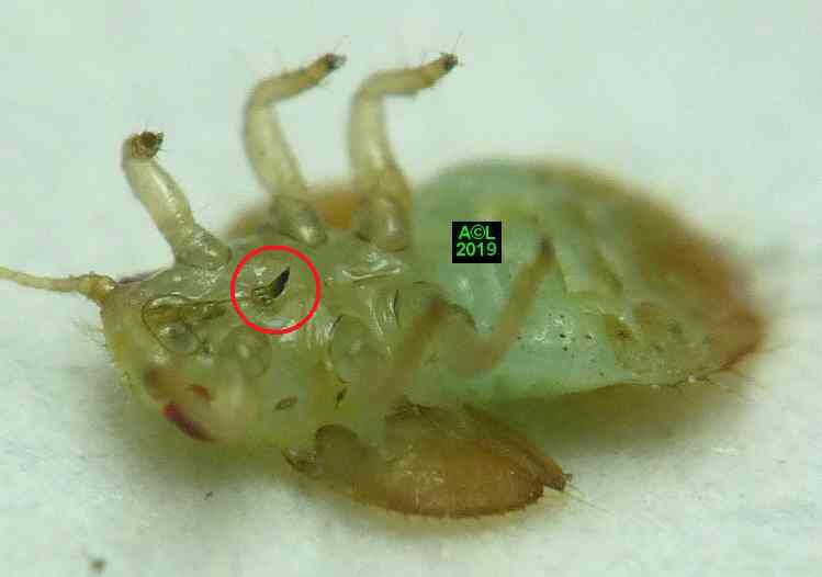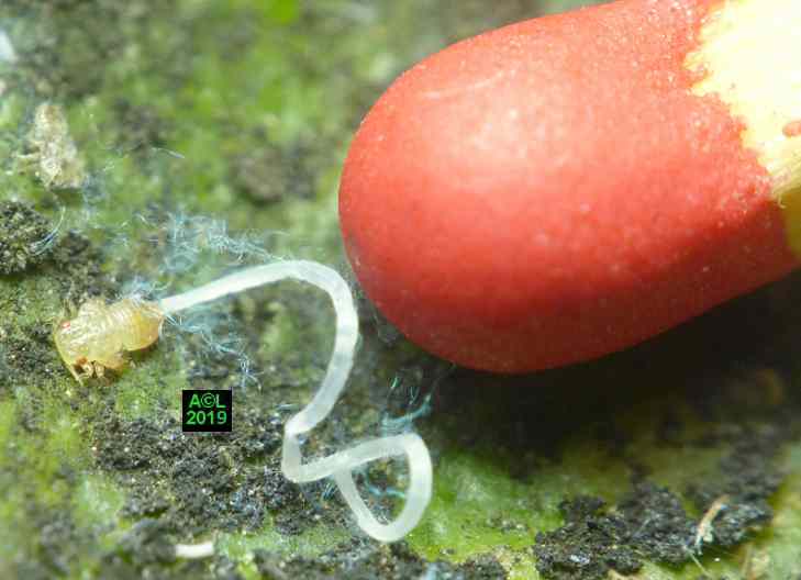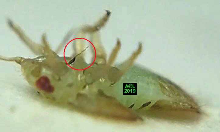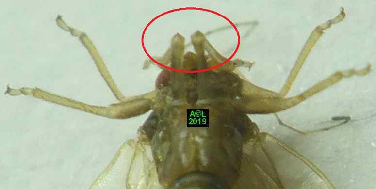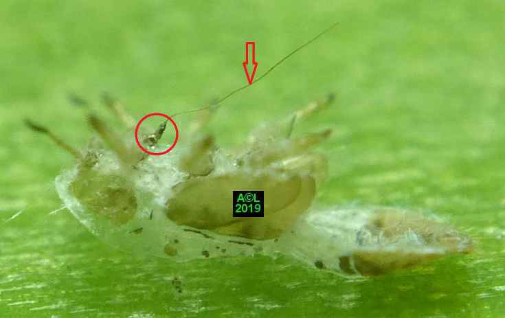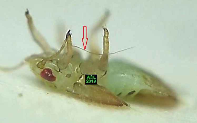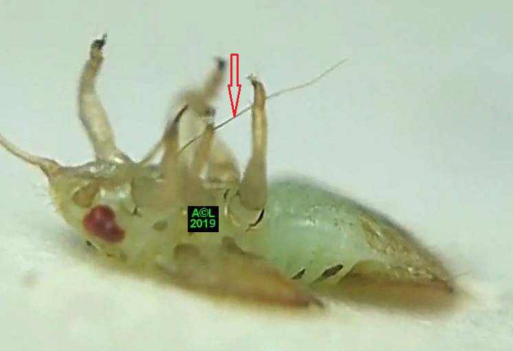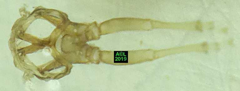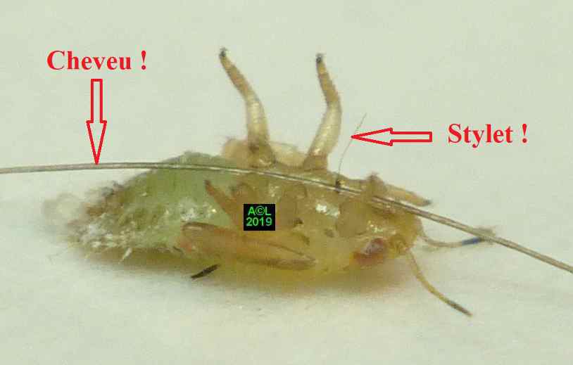Comme les illustrations ci-dessous et la vidéo le montrent, la longueur du stylet atteint en effet les 3/4 (bon compte ! ) de celle de la bestiole. Le fait est particulièrement patent sur une exuvie imaginale, ce qui confirme la nature chitineuse du stylet, et permet de rappeler que TOUT ce qui est chitinisé mue, y compris les plus fines structures, qu'il s'agisse par exemple des trachéoles aérifères ... ou d'un stylet quelques dizaines de fois plus fin ... qu'un de mes cheveux !
