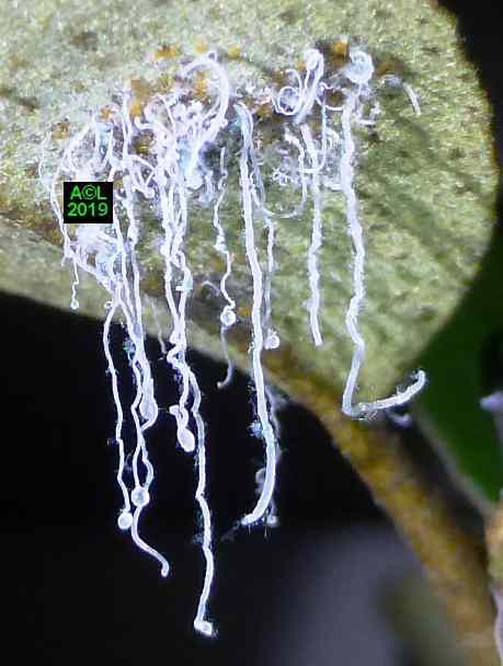 Concrètement le rostre proprement dit pratique une sorte d'avant trou dans le "garde-manger", en l'occurrence dans les feuilles de l'éléagnus, puis le stylet entre en action et va "pomper" la sève ... là où elle se trouve ! Logique me direz-vous, sauf que le fameux stylet est particulièrement long, beaucoup plus que nécessaire en apparence, sauf à considérer qu'il puisse s'insinuer dans les canaux foliaires pour y puiser le liquide nourricier, ce qui est certainement le cas. Reste à savoir où et comment la bestiole "rengaine" son interminable stylet !