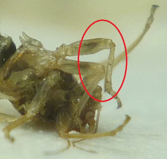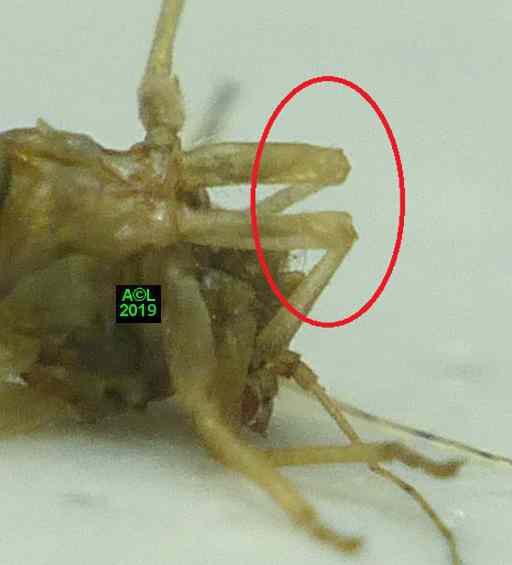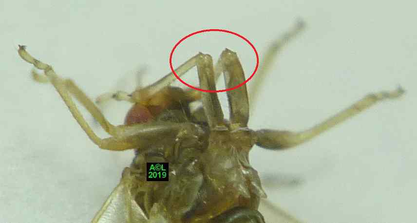 A contrario les pattes postérieures des psylles sont quasi systématiquement rabattues sur la tête, tout en restant le plus souvent subparallèles, mais aussi très rapprochées comme le sont leur insertion au niveau des hanches ( = coxa ! ). Il était évidemment difficile de ne pas y voir un rapport avec le saut, la constance de cette position laissant en outre présager une sorte d'effet ressort susceptible de pouvoir "s'armer". Si tel est bien le cas, le "mécanisme" devrait logiquement siéger au niveau du renflement des hanches et de leurs 2 énigmatiques "pointus". Le "squelette" des pattes postérieures, précédemment illustré, semble bien le confirmer.