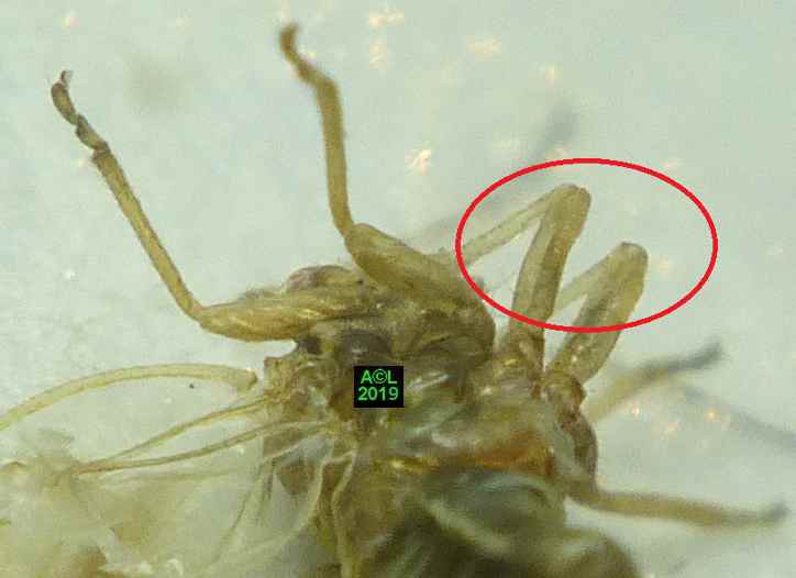 Concernant les psylles, et plus spécialement celui de l'éléagnus, la littérature et le web se contentent de mentionner leur capacité à sauter ... comme des puces ! Dans le meilleur des cas, faute de mieux, il est fait mention de fémurs postérieurs "légèrement renflés" (Encyclopaedia Universalis par exemple), mais la réalité est tout autre. Si l'aspect des pattes postérieures s'avère en effet très banal, et conforme aux autres membres, leur position à l'instant " T " est à coup sûr particulièrement originale. Cela semble "tout bête", mais compte tenu de l'instantanéité du saut, il m'a fallu un "certain temps" pour subodorer le processus, puis comprendre ... "comment ça marche" !