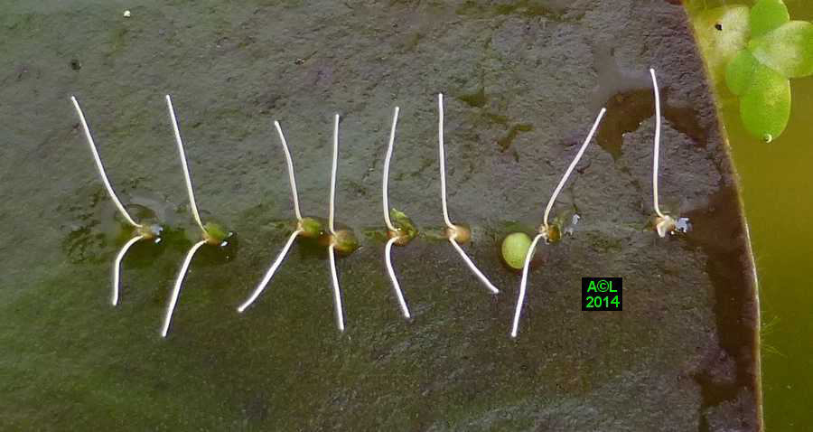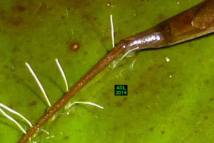 Pour redoutable qu'elle soit, la ranatre a bien sûr des ennemis, et si son mimétisme est précieux pour chasser, il l'est également pour éviter ... d'être chassée ! Par-delà les poissons carnassiers des plans d'eau de quelque importance, ou encore les grands dytiques et leurs larves peuplant la moindre mare, il faut aussi compter avec de minuscules et insatiables "suceurs de sang" ... et la ranatre ci-dessous en sait quelque chose !