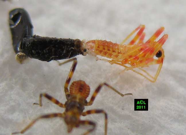 Sauf intrusion accidentelle, cet autre réduve est un hôte des espaces naturels plus ou moins "fricheux". L'espèce est surtout connue de la France centrale et méditerranéenne, mais elle "remonte" plus ou moins ça et là. C'est une espèce d'assez grande taille, diurne, héliophile ( = aimant le soleil ! ), et bien sûr carnassière, comme le sont tous les réduves. La piqûre est là aussi douloureuse, mais je n'ai pas testé ... tout en étant à 2 doigts de le faire ! ... expression on ne peut plus de circonstance !