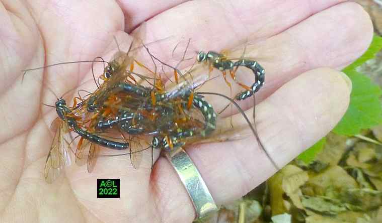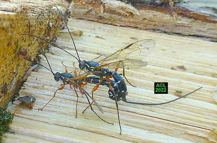 Alors que le percement du trou de sortie témoigne évidemment du quasi achèvement du processus de sclérification ( = durcissement des téguments ! ), la longue tarière des femelles reste au contraire aussi rigide qu'un brin de laine, ce qui lui permet de subir sans dommages la furia sexuelle des mâles, avant d'elle-même se sclérifier et d'ainsi devenir apte à forer le bois ... et y pondre !