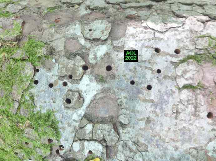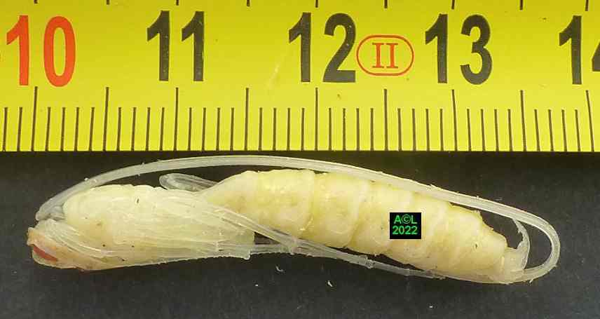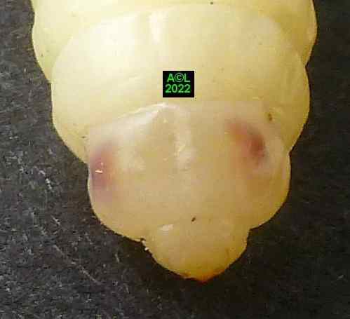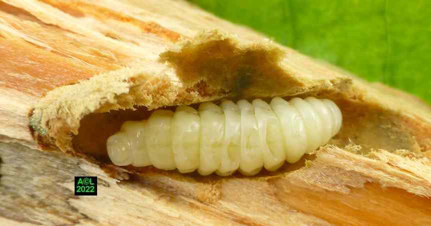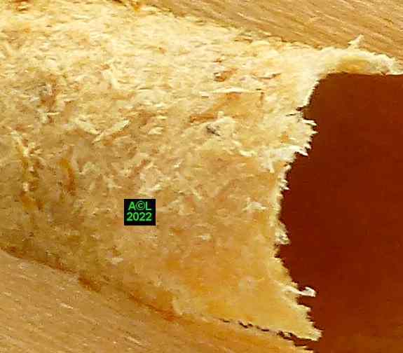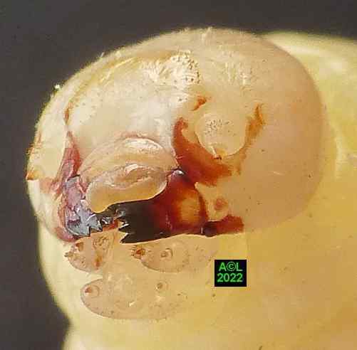 Le moment venu la rhysse devenue adulte va gagner l'air libre, là aussi à coups de mandibules. Concernant ces dernières la larve du sirex est manifestement bien dotée, leur forme pouvant se qualifier de classique. A contrario la larve de rhysse est simplement pourvue d'une sorte de croc triangulaire, a priori peu adapté au forage. Suite à un respectable volume de bois débité, et aux multiples galeries et cocons ainsi mis à jour, il a bien fallu me rendre à l'évidence, et donc attester d'une adéquation au forage de prime abord peu évidente.