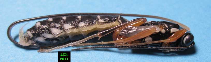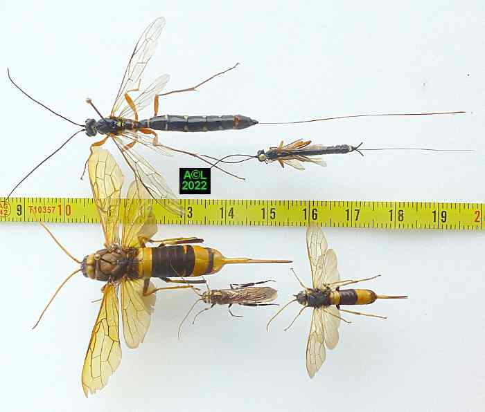 Pour corroborer le fait j'ai encore en mémoire le cas d'une larve de Rhagium bifasciatum, quelque peu " oubliée " dans un tube à essai, de surcroît à nu et sans la moindre parcelle de nourriture. Contre toute attente elle est parvenue à muer, et passer ainsi au dernier stade larvaire, au prix d'une étonnante et notable réduction de taille, avant de donner vie à un " minuscule " imago, via une nymphe à l'avenant. Pour anecdotique qu'il soit, le fait témoigne bien de la probable origine des " mini-rhysses " sans pour autant expliciter le cas des sirex.