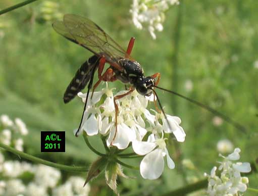 De très nombreuses espèces d'insectes apprécient les inflorescences des ombellifères, et les Rhysses en font partie, comme les illustrations ci-dessous le montrent. Vous noterez que ces bestioles sont du genre à "mâchouiller", plutôt qu'à butiner !