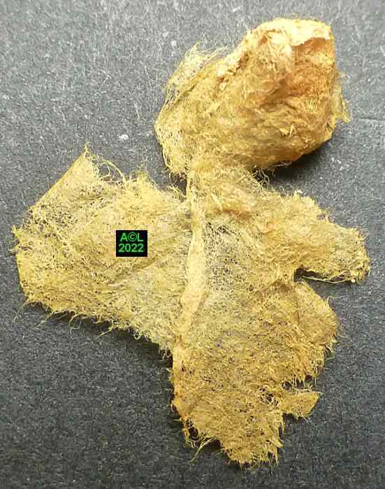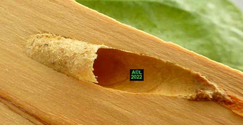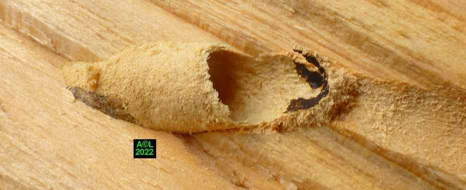 Arrivée à terme la larve de rhysse va quitter l'espace initialement occupé par celle de sirex. A cette fin elle fore une galerie, relativement courte, où elle va élaborer un cocon finement constitué de sciure et de soie où elle va se nymphoser. Vous noterez que les cocons adhèrent plus ou moins fortement aux parois des galeries d'où l'impossibilité de pouvoir les extraire dans leur intégralité. C'est d'autant plus vrai que le débitage du bois implique l'emploi d'outils appropriés (tels que scie, coins acier, ciseaux à bois, marteau ! ).