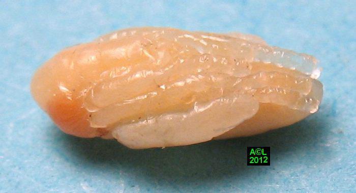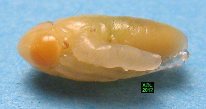 Une fois la pupe formée, les grandes manoeuvres de la métamorphose vont pouvoir commencer. Très schématiquement les organes et tissus de l'asticot vont disparaître (= "histolyse") au profit d'un amas cellulaire qui va progressivement s'organiser (= histogenèse) pour donner une nymphe, préfiguration de l'insecte adulte. Les illustrations ci-dessous témoignent du processus, et de la formation récente de la nymphe, eu égard à l'absence de pigmentation. Ces photos ont été réalisées une semaine après la formation des pupes.
