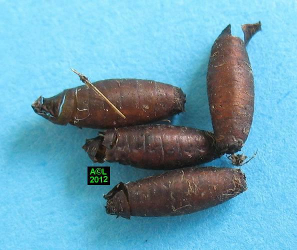 Pour les amateurs de chiffres et dates, vous noterez que les oeufs ont été récoltés in natura le 22 Février (2012), puis placés pour élevage "en intérieur", à 20°. L'éclosion des oeufs est intervenue le 27 du même mois, et les premières émergences des adultes le 13 Mars. Contrairement aux 2 générations annuelles plus ou moins "officielles", la rapidité de ce développement me semble confirmer la possibilité de multiples générations, le nombre étant bien sûr fonction de la région, et des conditions météo de l'année.