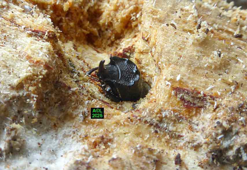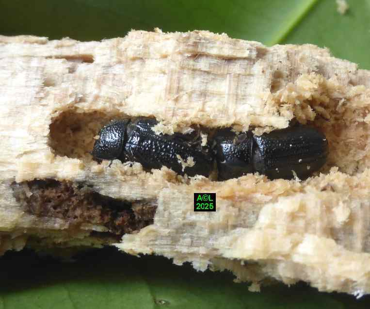 Contrairement à ce que l'on peut lire et relire sur le web, les murs nocturnes de Sinodendron cylindricum me posent question. De fait, et j'ai eu tout loisir de le constater durant plus de 2 mois, la noire bestiole sort de sa retraite l'après-midi, souvent en seconde partie, et son activité donne lieu à de classiques "scènes de vie". Les envols sont également fréquents, et répétitifs, avec attirance très marquée pour la lumière du jour et le vitrage de mon séjour ! La nuit venue, crépuscule compris, les "sino" restent invisibles, mais au sein du bois l'activité dans les galeries doit plus ou moins se poursuivre à en juger par les déblais évacués sous la forme de minuscules copeaux.