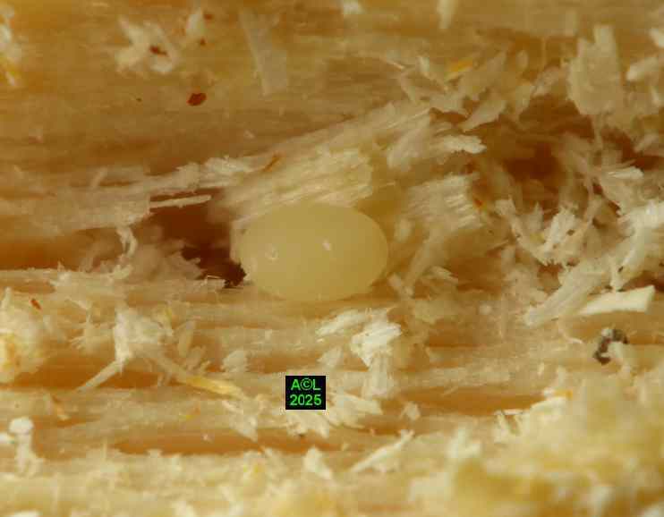 Chez les insectes les femelles peuvent parfois prendre soin de leur progéniture, à l'image du fameux perce-oreille qui d'ailleurs n'a jamais rien percé ! A contrario les mâles se bornent le plus souvent à "l'essentiel", mais là encore les "sino" témoignent d'une belle originalité. De fait, et aussi étonnant que cela puisse paraître, le mâle "monte la garde" à l'entrée de la galerie où la femelle est à l'uvre. Les oeufs sont le plus souvent émis dans un "cul de sac" de galerie, mais de courtes dérivations sans issues sont toutefois possibles. Dans tous les cas (comme les illustrations le montrent !), les ufs sont déposés au sein de fins copeaux peu densément amalgamés, là où la très parcellaire littérature fait état de "cupules en spirales" (sic) disposées le long de la galerie de ponte.