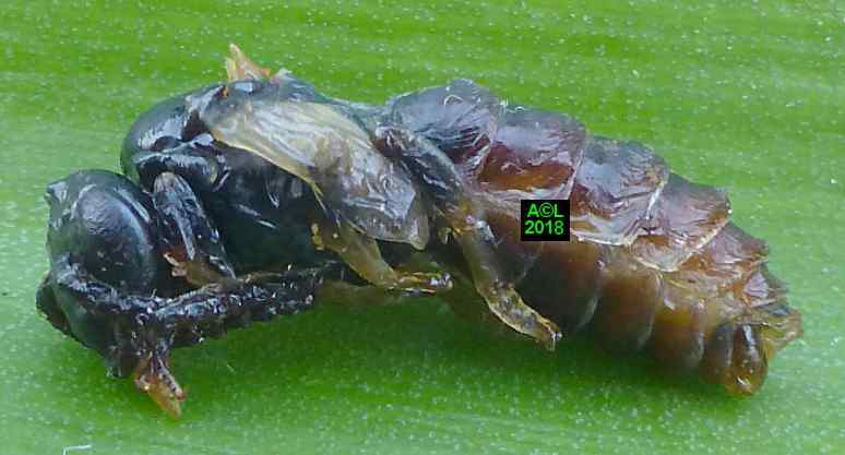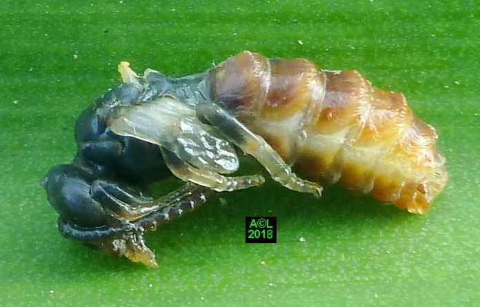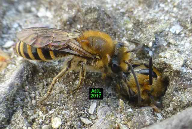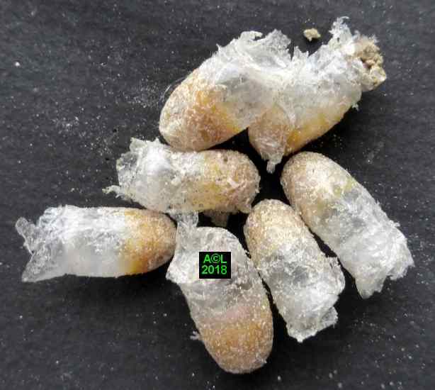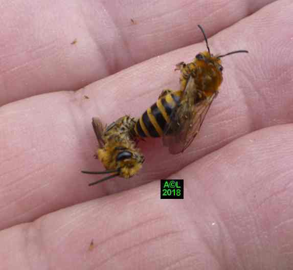 Ce premier "sondage" a eu lieu à le 10 Avril, et pour éviter de fausser la donne les fouilles ont été réparties sur 5 "bourgades" différentes. En raison de la fragilité des cellules, et d'un sol rendu compact par les ans et l'abondance des pluies, la "casse" était aussi inévitable qu'importante. Sur les 60 cellules ainsi trouvées, 42 ont plus ou moins "souffert", et sur ces dernières 12 se sont avérées parasitées. Il s'ensuit un taux de 28,6 %, certes élevé, mais néanmoins très en deçà de ce qu'il pourrait être, d'où une probable capacité des abeilles femelles à éliminer une partie des parasites ( les moins "futés" ? ou rapides ? ) lors de la nidification.