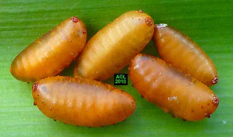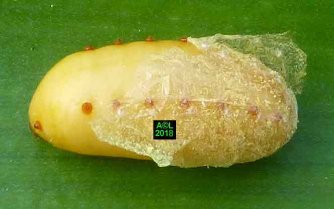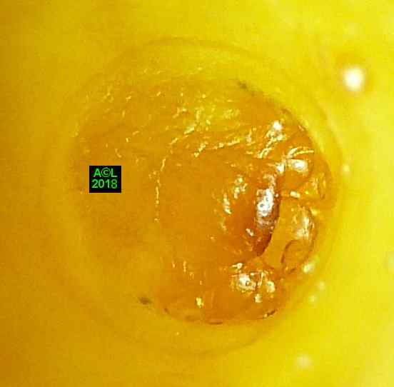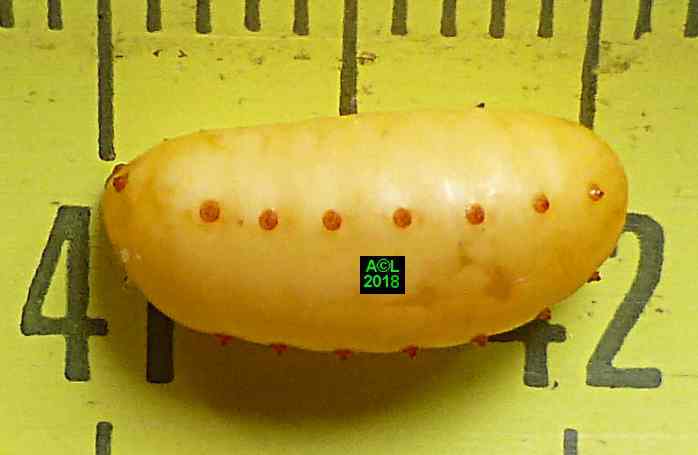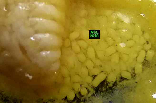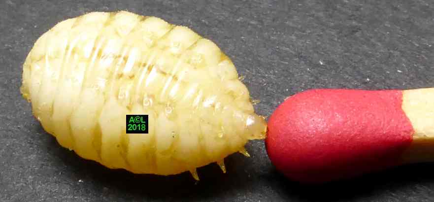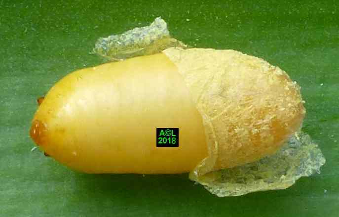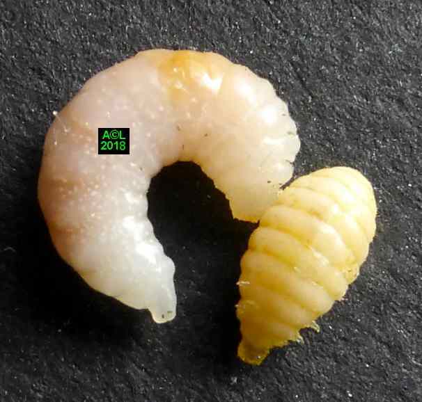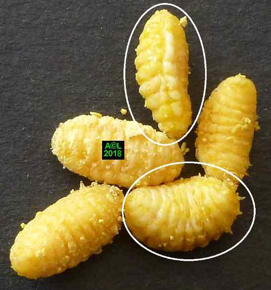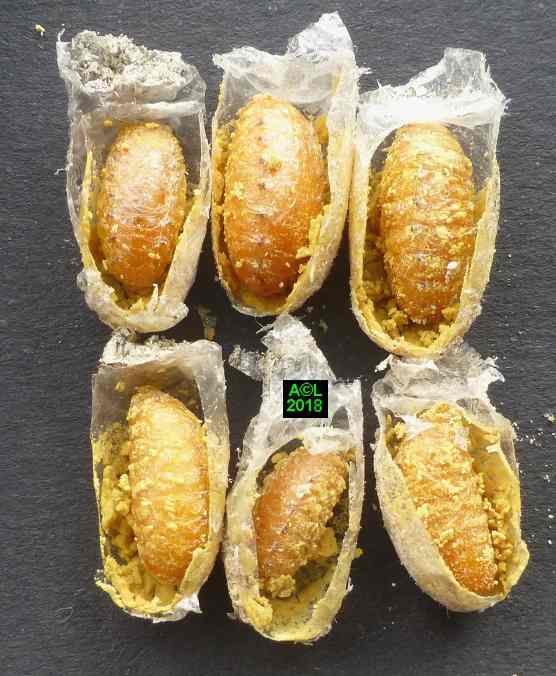 Dans le cadre du suivi larvaire de S. analis, un énième "raid" sur le site d'Abbaretz ( le premier datant d' Août 2017 ! ) m'a permis de "récolter" 10 cellules parasitées (sur 28) toutes issues d'une même "bourgade". Les "garde-manger" vides, la totale immobilité des larves parasites (à 2 exceptions près), et leur position verticale, tête en haut, m'ont de suite alerté. Après extraction et "toilettage" (des crottes plus ou moins desséchées et fragmentées restant çà et là collées) les pseudonymphes se sont avérées formées, hormis les exceptions précitées.