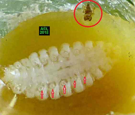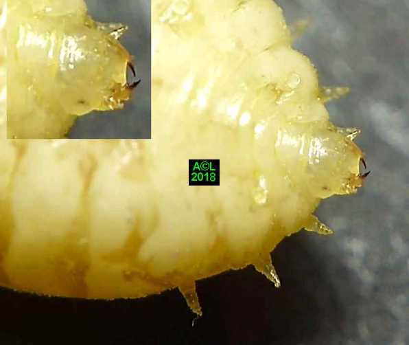 Le "miel" élaboré par les Colletes étant plus fluide que celui des abeilles domestiques, la larve parasite risquerait à coup sûr de s'y noyer ... d'où l'originale parade de Dame Nature ! Les larves de Stenoria sont en effet dotées d'une généreuse bedaine en forme de coque de bateau, ce qui leur assure une parfaite flottaison. Dans le même temps le "pont" du bateau, si je puis dire, est plat et doté d'un double alignement de stigmates trachéens, véritables bouches d'aération permettant à la bestiole de "respirer".