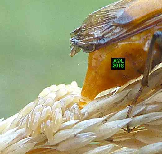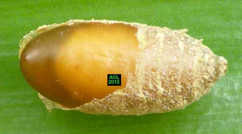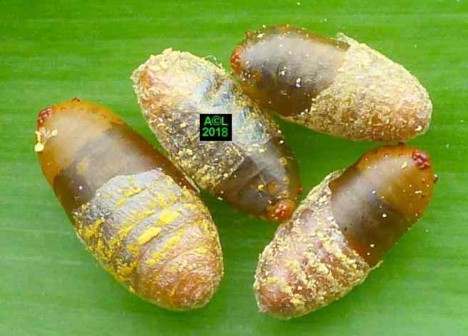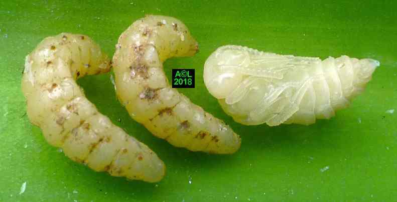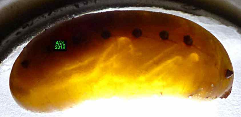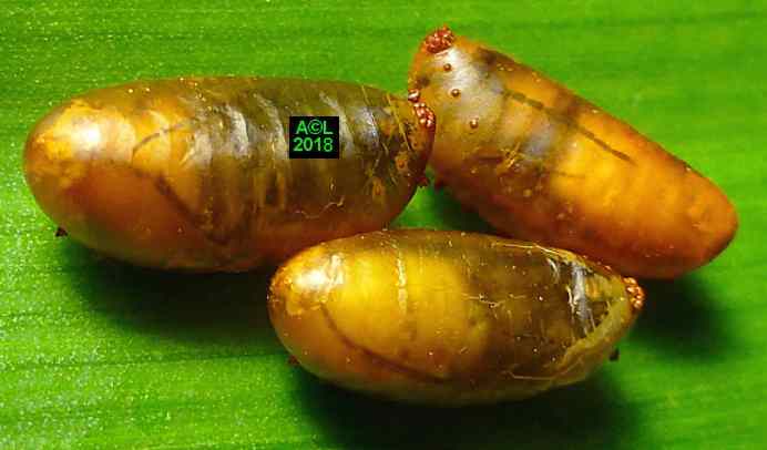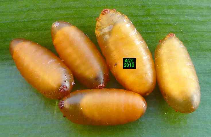 Déjà bien peu banal du fait de son hypermétabolie (se traduisant je le rappelle par 2 stades post-larvaires surnuméraires), le développement de S. analis se singularise également par la brièveté du stade prénymphal. Le plus souvent il est en effet d'une huitaine de jours à domicile, et en ce mois de juillet caniculaire (2018) je ne serais pas étonné qu'il faille encore moins sur site, tant la nature du terrain et son exposition sont susceptibles de générer des conditions optimales.