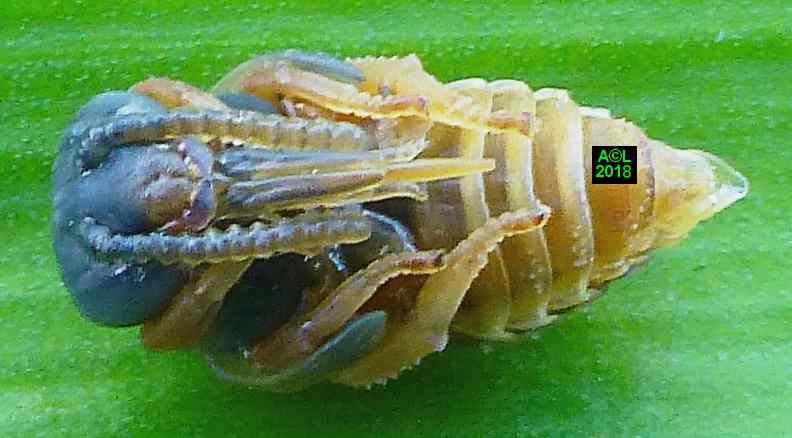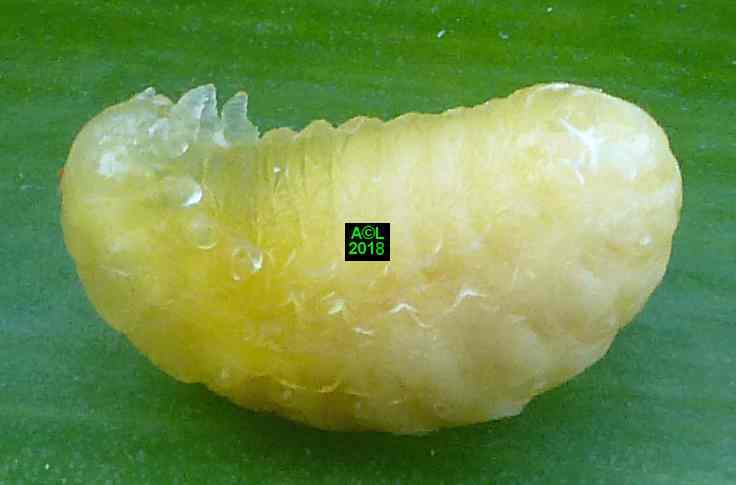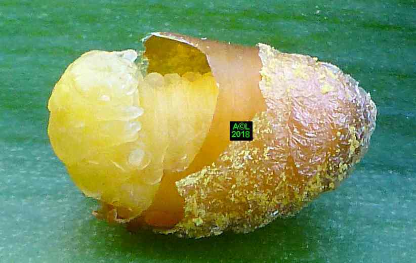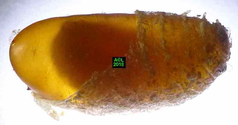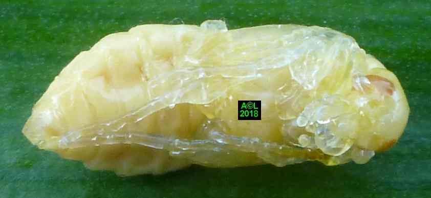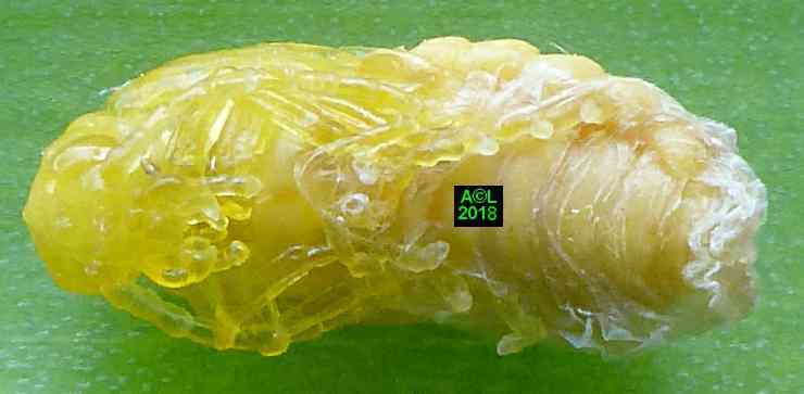 Maintenue en "élevage", une partie des pseudonymphes récoltées le 22 Mai m'a donné les premières prénymphes le 11 juillet. Comme les illustrations ci-dessous le montrent le terme de prénymphe est parfaitement explicite et judicieux, car les appendices (pattes notamment) sont à peine différenciés, et les étuis alaires (typique préfiguration de l'adulte), sont quant-à eux ... aux abonnés absents !