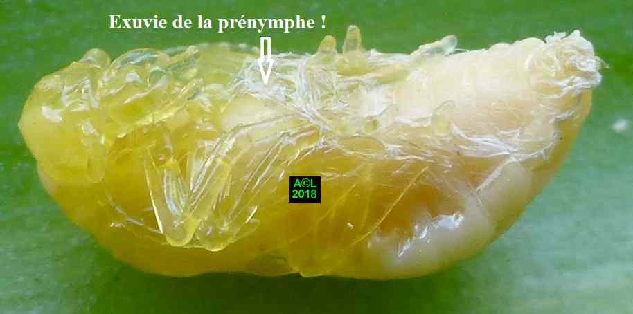Moyennant le retrait (aisé) de l'exuvie larvaire il est non moins facile de déterminer la survenue de la prénymphe en jouant sur la relative translucidité de l'enveloppe pseudonymphale. En "mirant" cette dernière, comme on le fait pour les oeufs, il est de plus possible de repérer l'ébauche des pattes, et d'ainsi confirmer le statut prénymphal.
