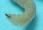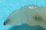 Sauf à tamiser le substrat, ou à bien connaître la bestiole, il n'est pas toujours aisé de trouver les larves. Outre leur relative petitesse (y compris à terme), elles sont en effet toujours enduites de particules sableuses ou poussiéreuses, et de surcroît elles ne bougent pas plus de la tête que du derrière. Cette immobilité, quasi cataleptique, est bien sûr une forme de défense ( savamment appelée "thanatose" ! ), car en temps normal, et donc au fin fond de son "antre", la bestiole est en fait extrêmement réactive.
