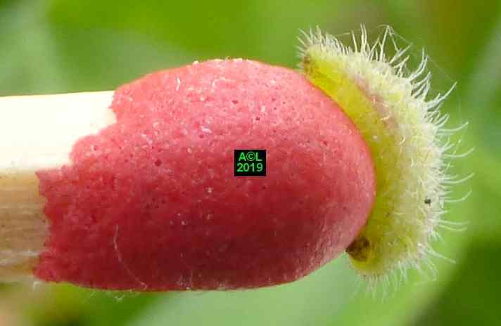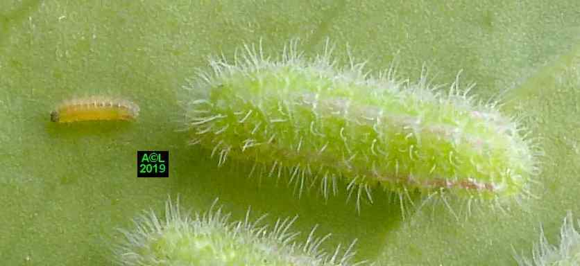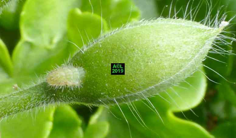 Les choses sont d'autant plus compliquées que cette chenille est petite, et que la tête, élément d'appréciation essentiel, est "escamotable" dans les replis du "cou", faculté dont la bestiole use et abuse. Pour couronner le tout, elle mue fréquemment au sein même des boutons floraux et des excréments qu'ils contiennent, d'où l'impossibilité de trouver et comparer les capsules céphaliques, véritable "preuve par 9" du niveau des stades larvaires. Vous l'aurez compris, les illustrations des 2e et 3e stades ne sont pas vraiment ... "garanties" !